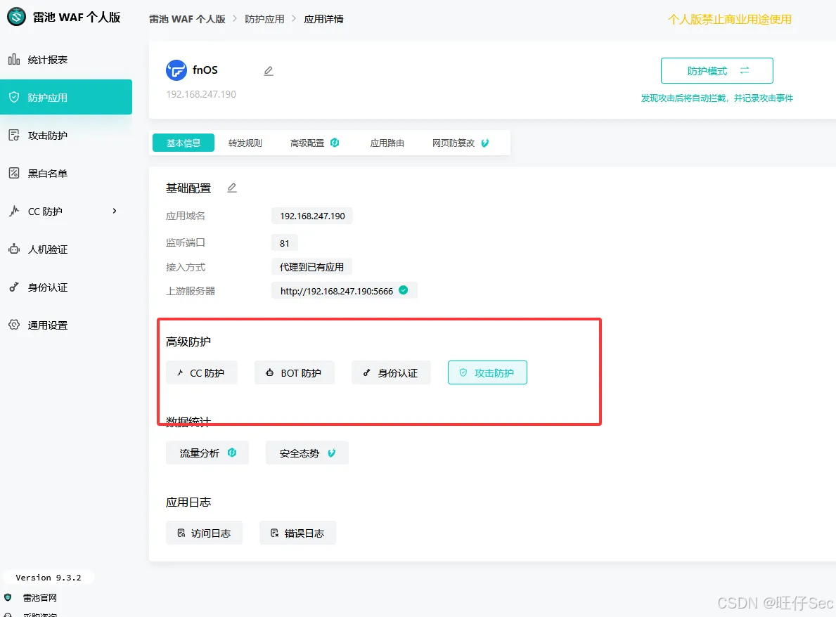 步骤3:配置防护规则(默认开启基础防护)