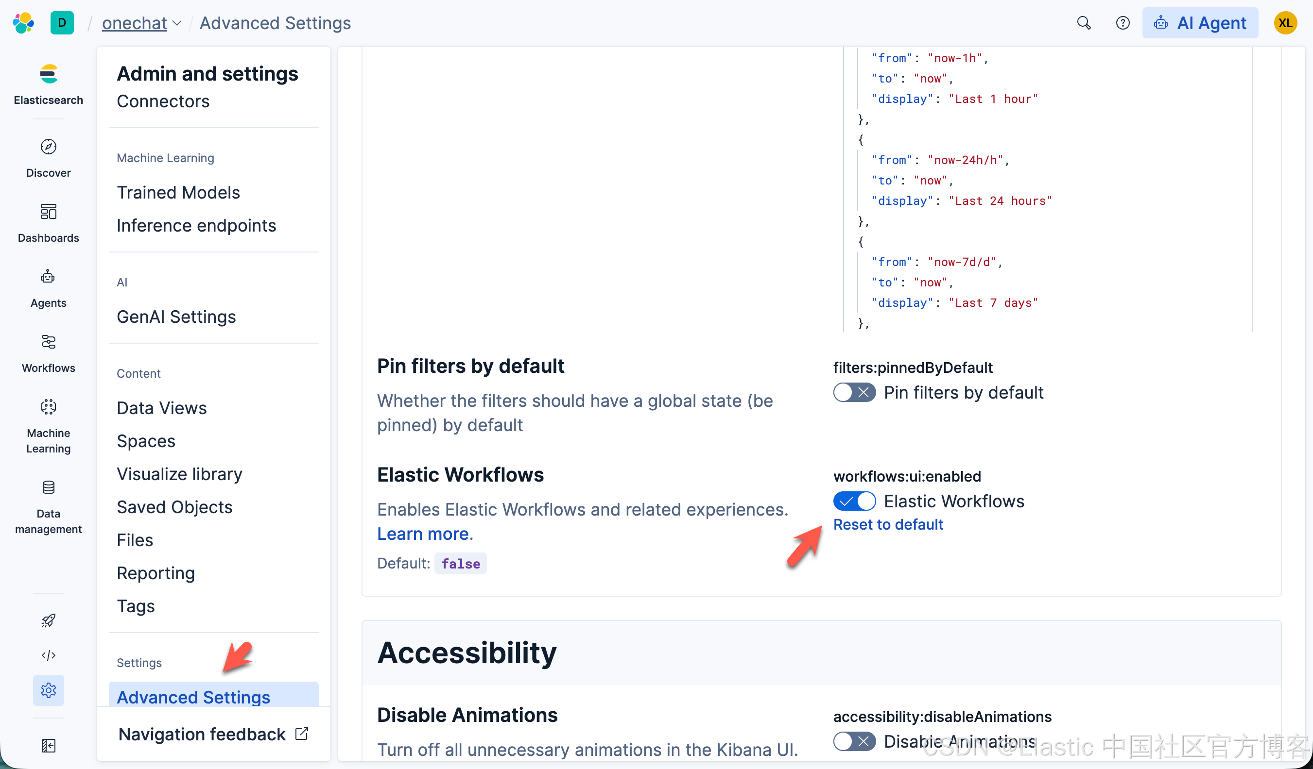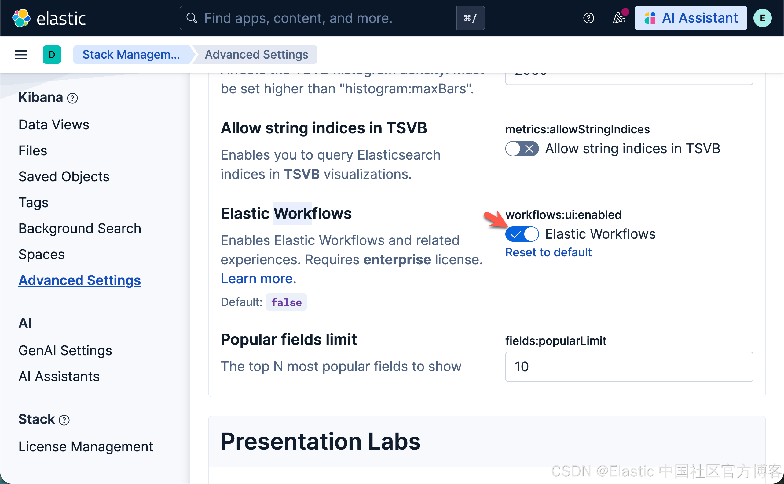要使用 工作流,请开启 Elastic Workflows(workflows:ui:enabled)高级设置。