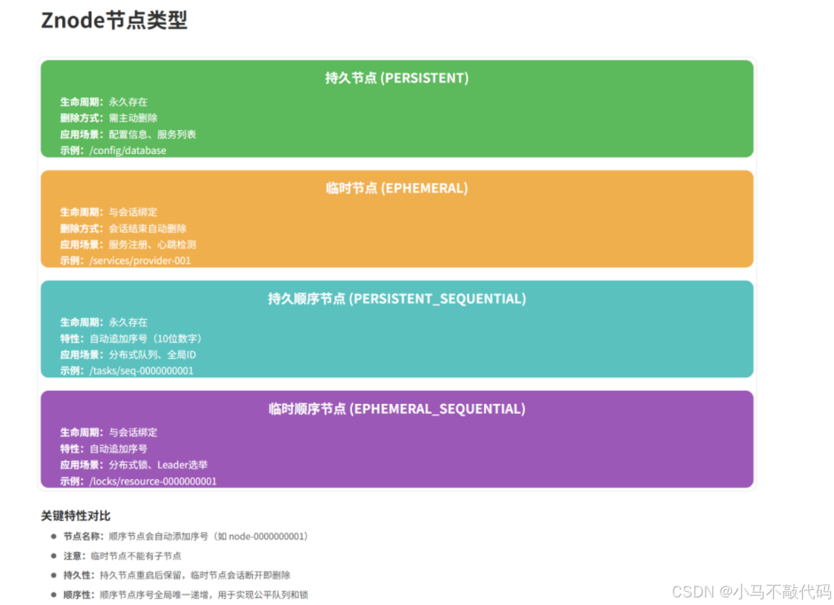 根据节点的生命周期和特性,Znode可以分为四种类型: