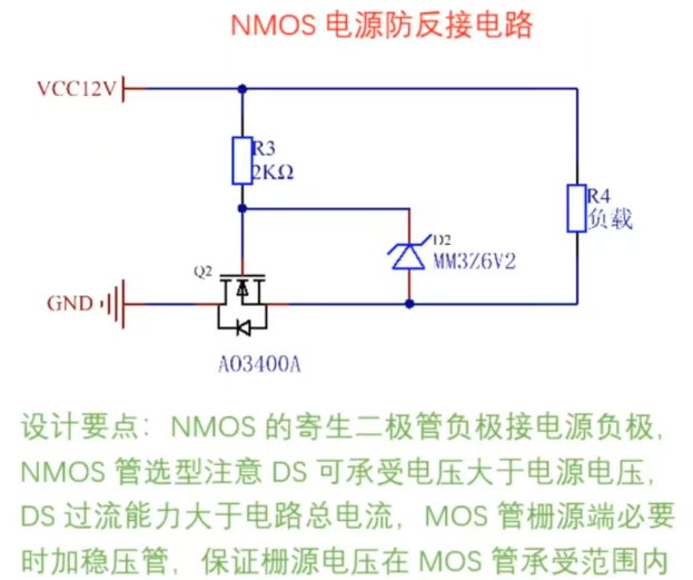 这是一个基于 N 沟道 MOS 管(AO3400A)的高效电源防反接电路,核心原理是利用 MOS 管的导通特性与寄生二极管的方向,实现 "电源正接时导通供电、反接时截止保护" 的功能,同时通过稳压管保护 MOS 管栅极。