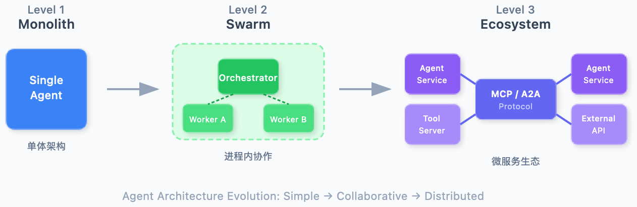 本章目标: 理解 Agent 架构从单体到生态的演进路径,掌握协议选型策略