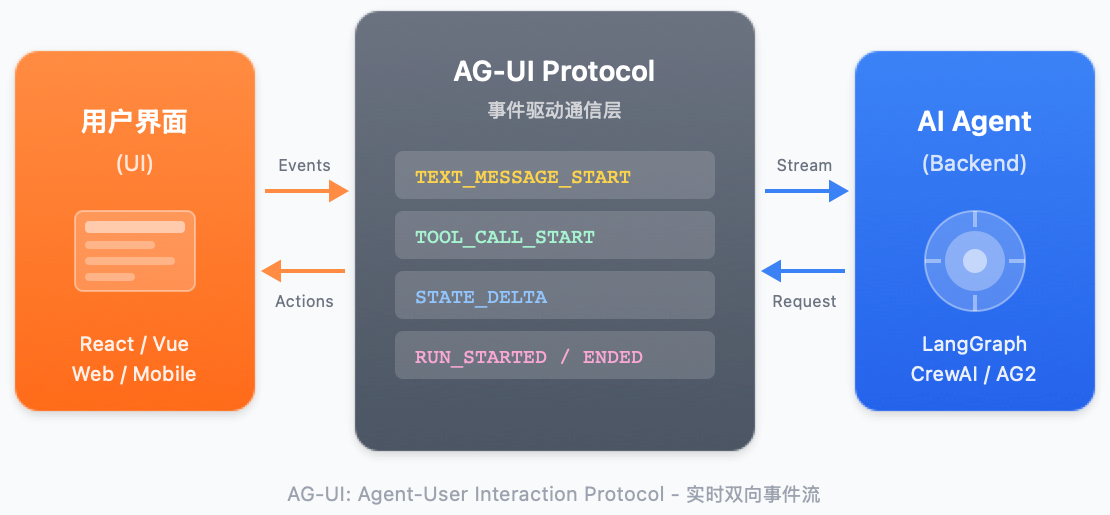- AG-UI:Agent 的"显示器接口",标准化人机交互