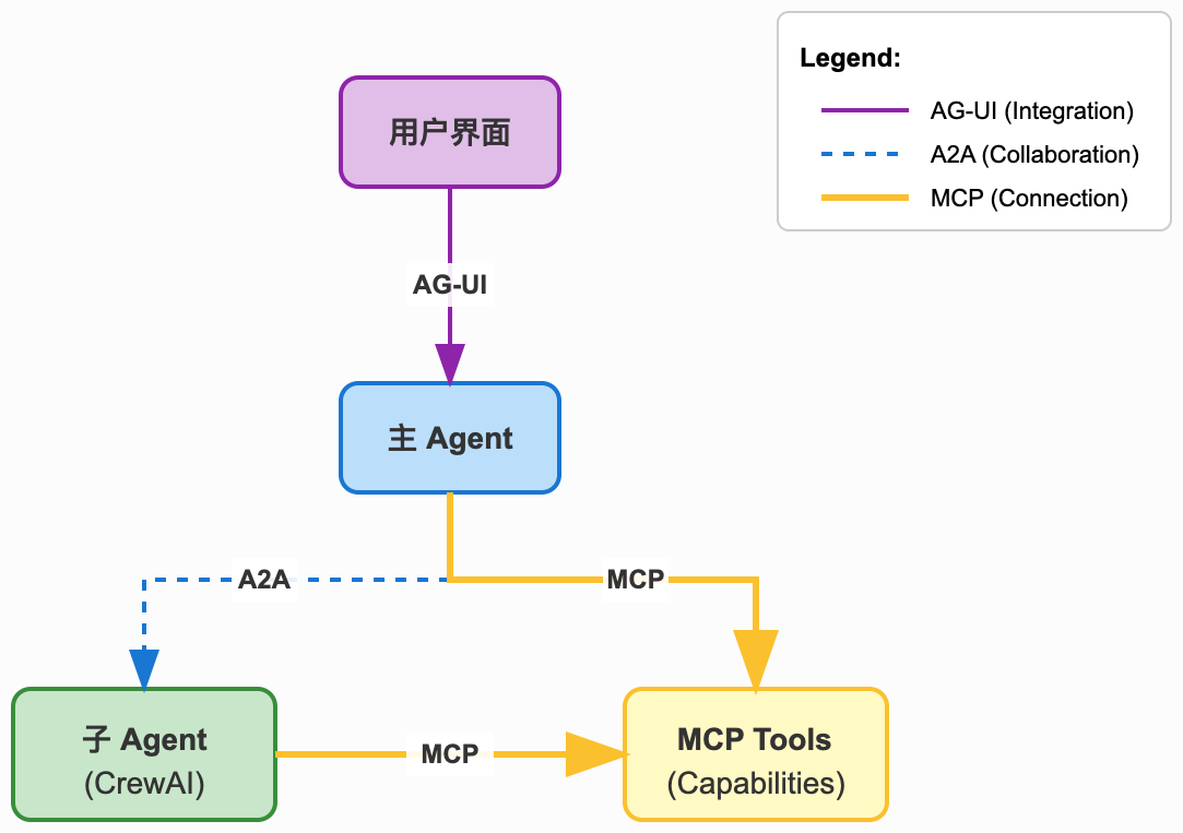 💡 关键洞察: 这三个协议不是竞争关系,而是互补关系。MCP 负责"Agent↔工具",A2A 负责"Agent↔Agent",AG-UI 负责"Agent↔用户"。