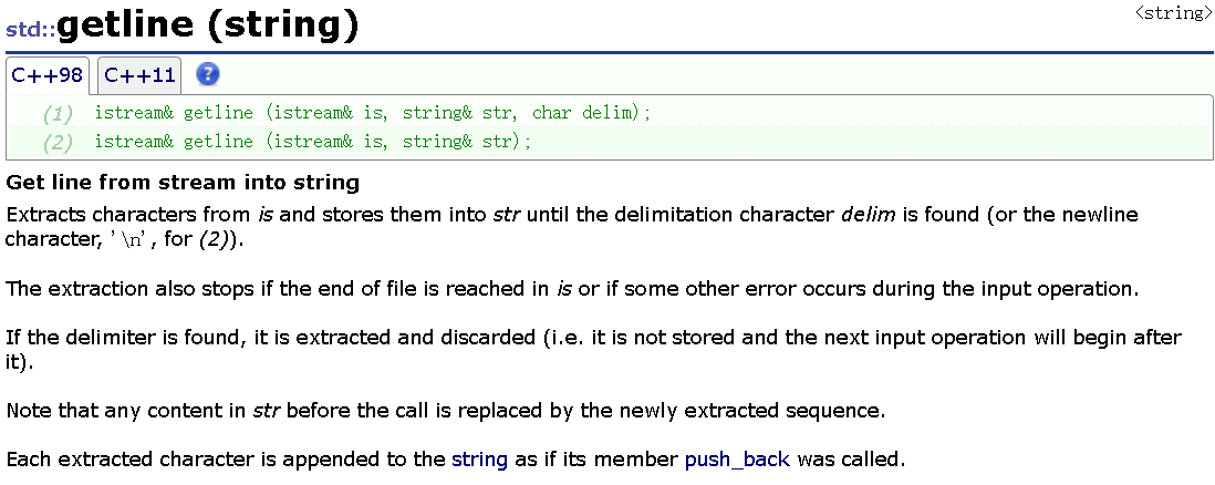 在平常的使用中,如果使用 cin>>string 读取字符串时,遇到空格就会停止。而 getline() 能读取一整行的内容,包括空格。默认回车结束,也可以自己指定结束的字符。