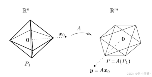 关键在于 :多面体 A(P1) 的"尖端"或"棱角"是其低维面,这些点对应着原空间 P1 中非常稀疏的向量(即顶点或面上的点)。由于 ℓ¹ 球本身的形状是"有尖角的",其映像的尖端也最容易"刺中"数据点 y,这就使得求得的解向量
