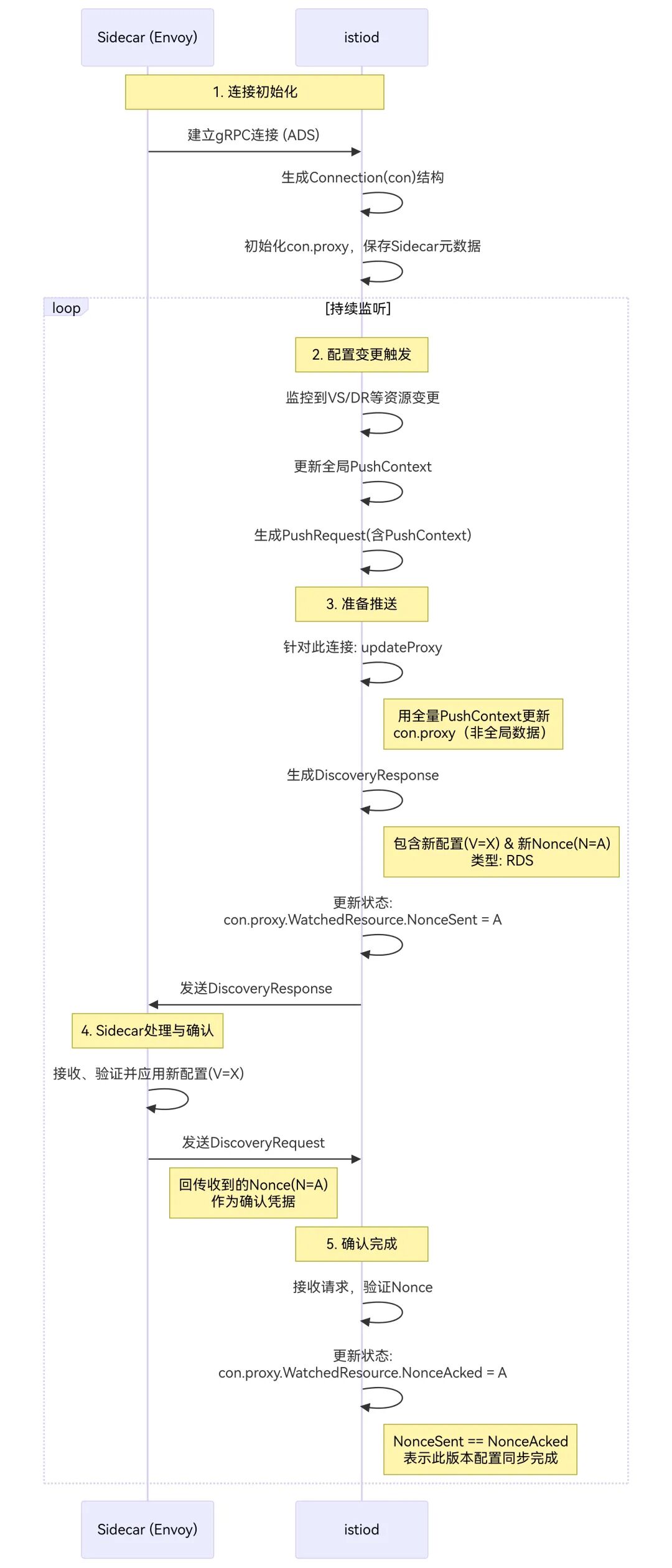 第二个:就是isitod和很多sidecar之间的xds数据的一致性如何保证,包括:正常进度的展示、出问题之后的异常处理策略(例如:重试、关闭劫持、摘除等等)