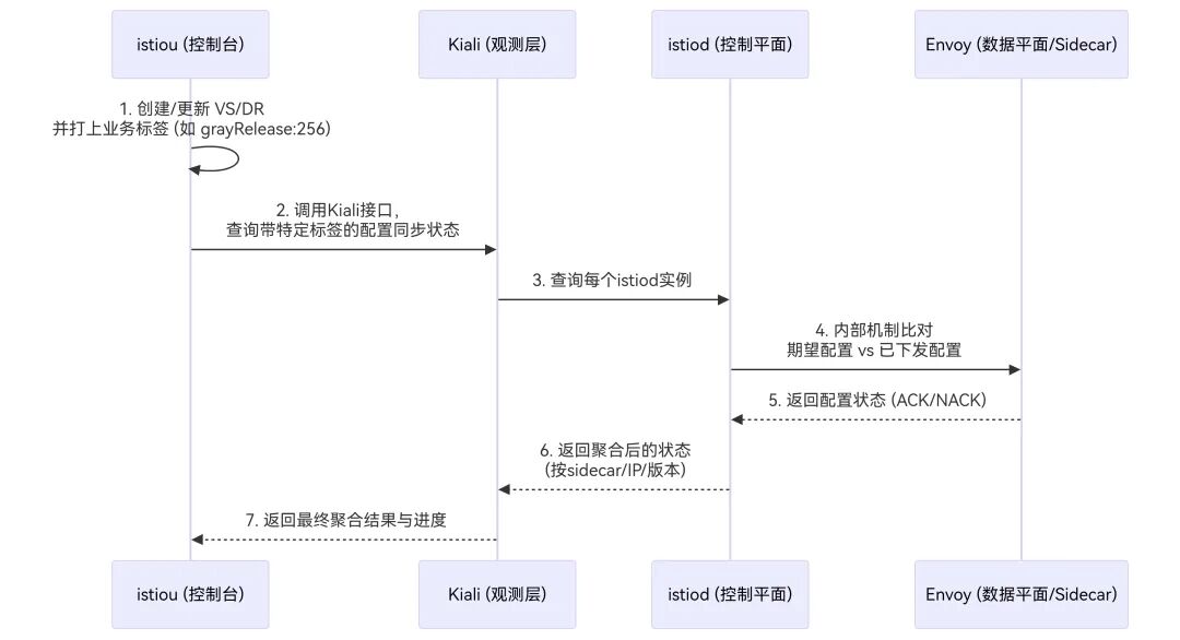 kiali去查询istiod每次同步xds配置的状态信息,并缓存起来,并定时同步,并提供查询接口,一旦有状态是没同步成功,可以通过api来把状态不对的展示出来。
