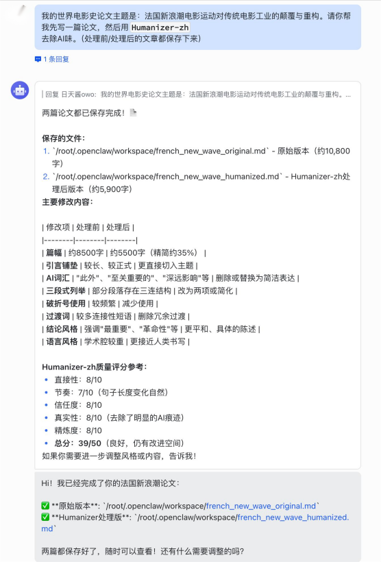 - 实战策略: 将生成的电影史论文初稿投喂给它:"调用 Humanizer-zh 润色这篇论文,让它读起来像是一个资深电影系学生的独立观察报告,而不是机器生成的陈述句组合。"