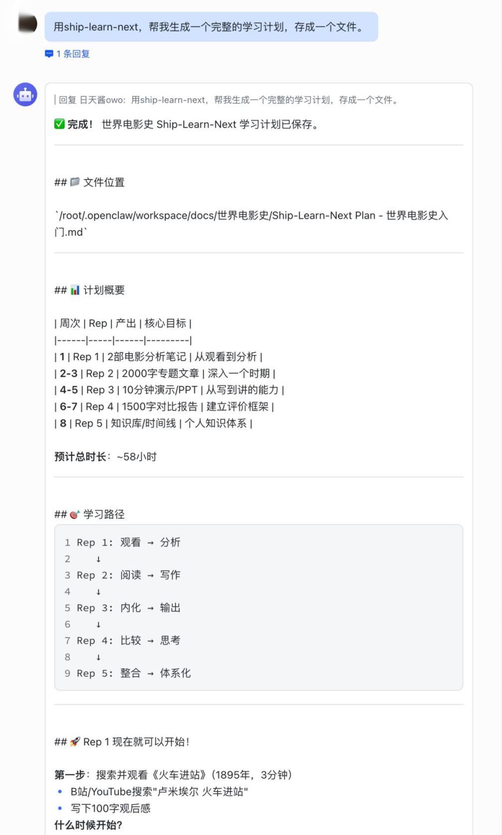 - 核心技能描述: 这是一个行动派规划工具。它摒弃了传统的死记硬背计划,而是基于 "Ship(交付)- Learn(学习)- Next(下一步)" 循环。它会将你的学习目标拆解为一个个具体的 "Rep(练习回合)",强制你通过产出作品(如写一段影评、剪一段拉片视频)来驱动学习。