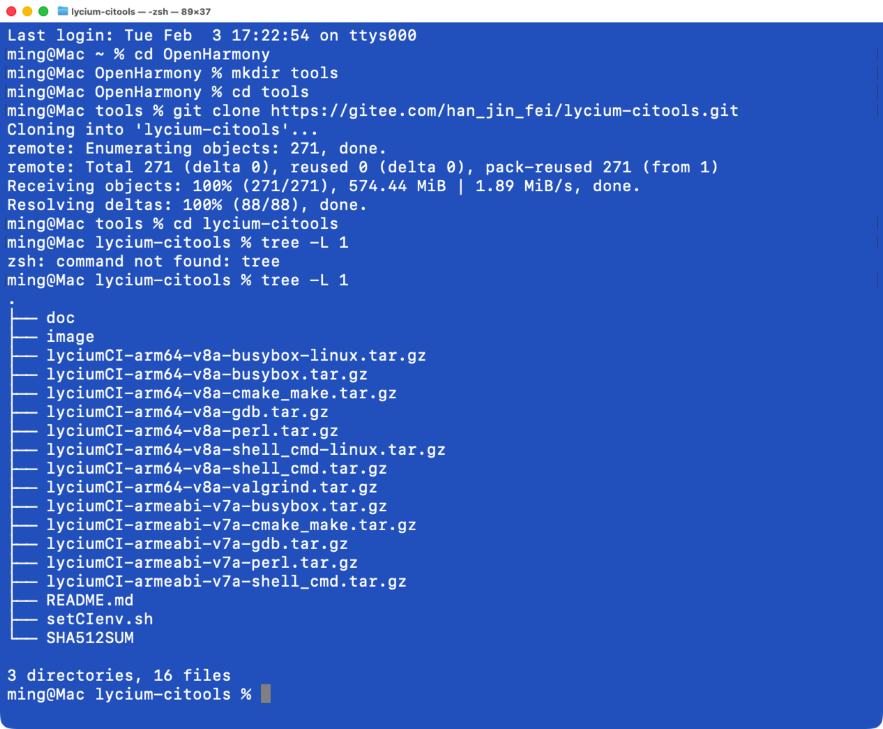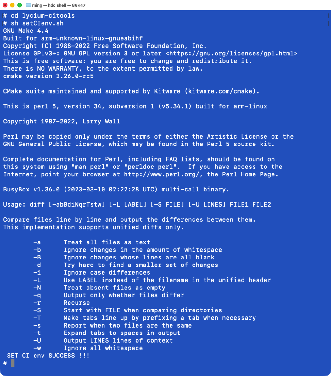 解压完成后,进入lycium-citools目录,执行sh setCIenv.sh命令自动完成CI环境配置。