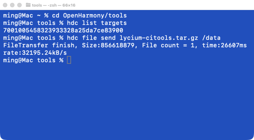 执行以下命令查看开发板是否已经链接,使用hdc file send将lycium-citools压缩工具包上传。