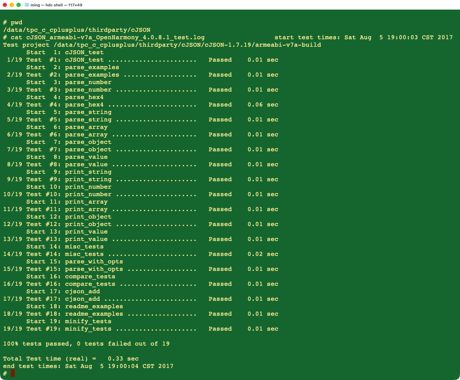 出现check cJSON success表示测试成功,在/data/tpc_c_cplusplus/thirdparty/cJSON目录下可以查看测试日志文件cJSON_armeabi-v7a_OpenHarmony_4.0.8.1_test.log。