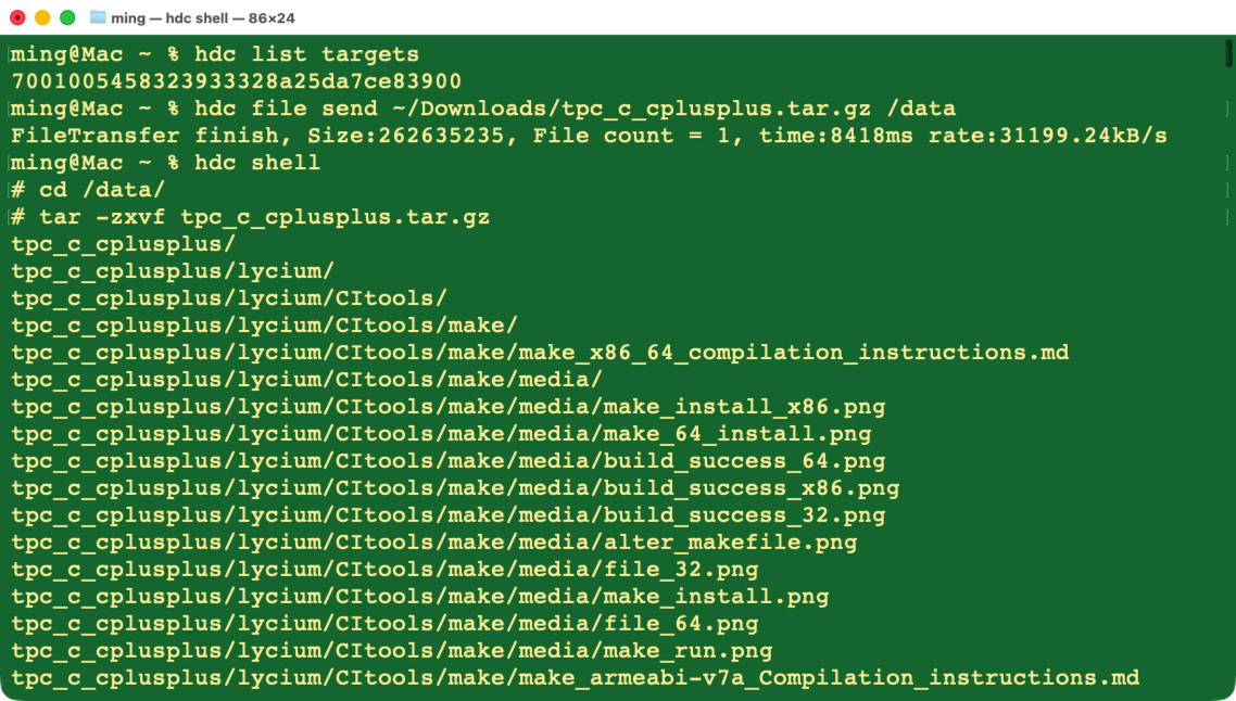 执行hdc file send tpc_c_cplusplus.tar.gz /xxx命令将压缩包推送到ohos设备上。执行hdc shell进入命令行交互模式,进入data目录执行命令tar -zxvf tpc_c_cplusplus.tar.gz解压刚才上传的压缩包文件。