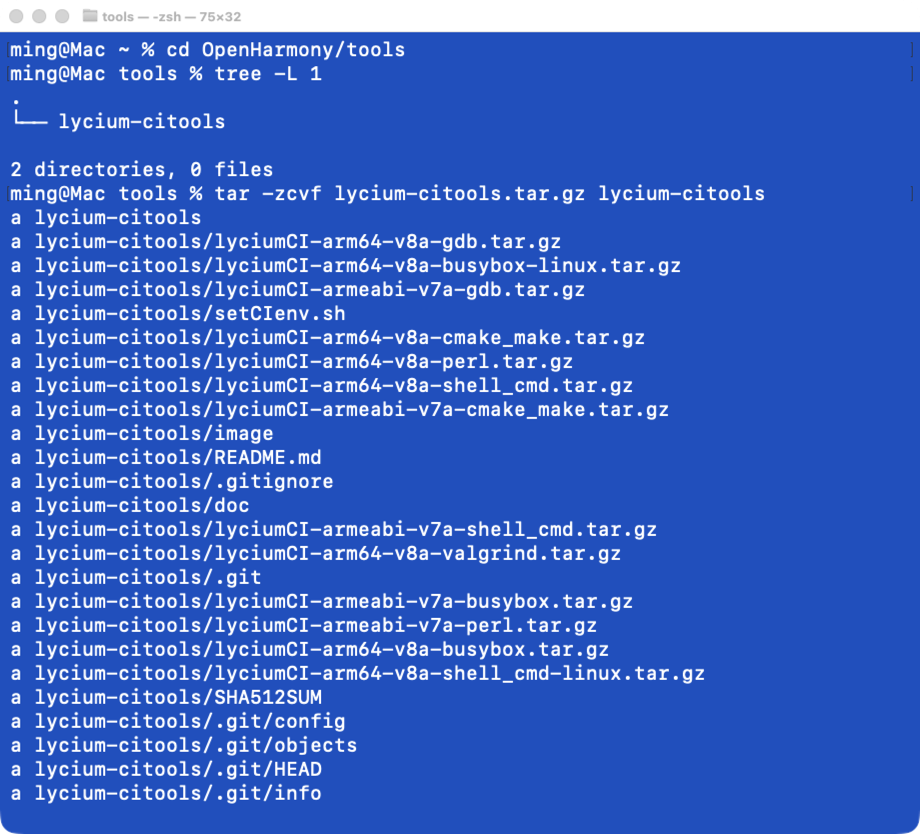 执行hdc shell进入命令行交互模式,进入data目录执行命令tar -zxvf lycium-citools.tar.gz解压刚才上传的压缩包文件。