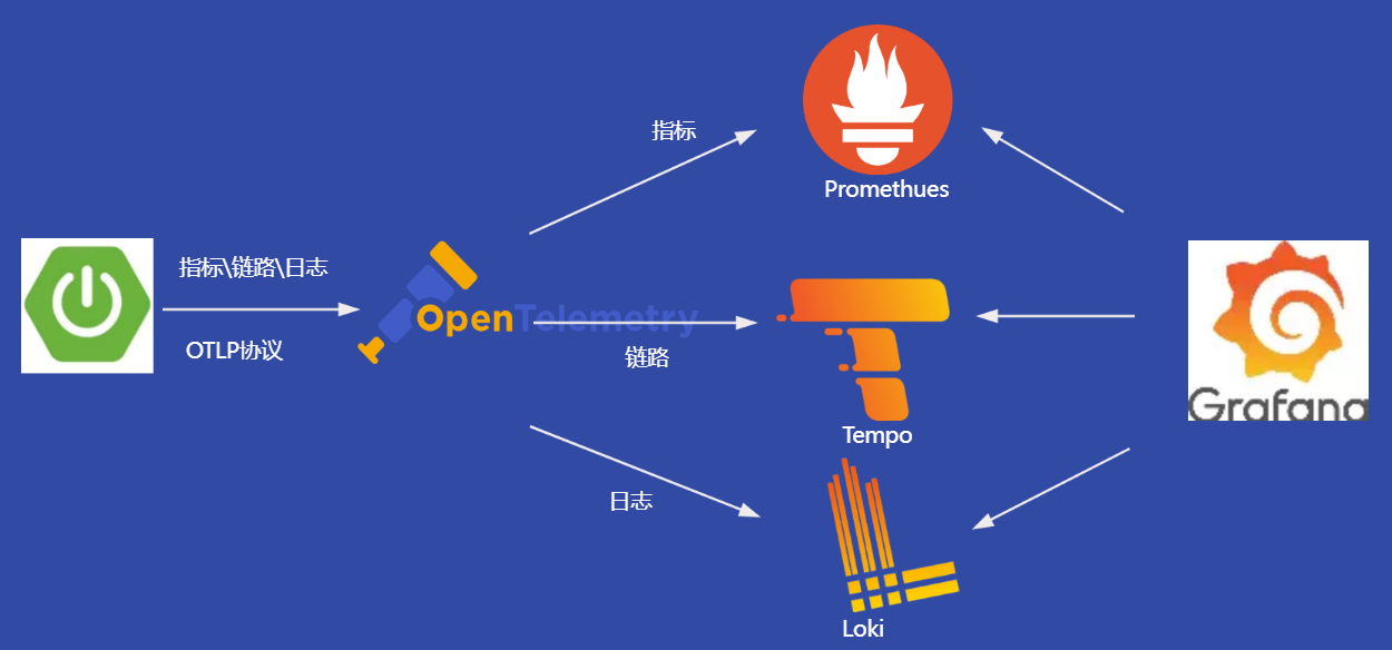 SpringBoot应用使用OTLP协议上传指标、链路、日志数据给OpenTelemetry服务端,然后OpenTelemetry把指标转发给Prometheus,把链路转发给Tempo,把日志转发给Loki,最后通过Grafana对外提供统一的UI展示。