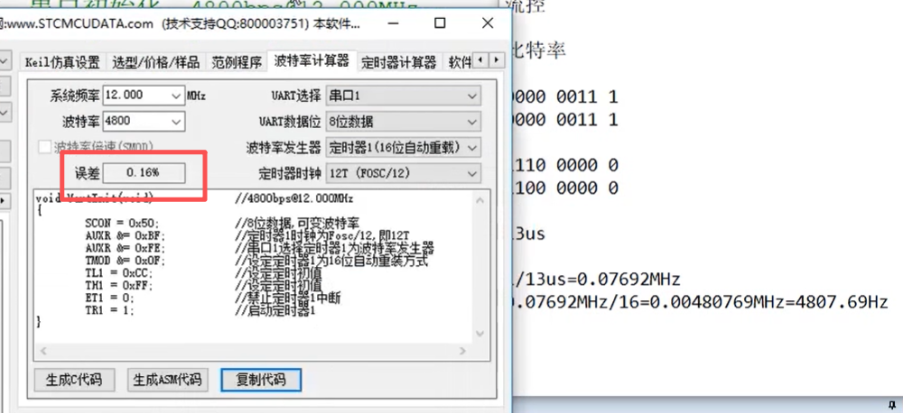 计数值是13个数,每记13个数就溢出一次,定时器,12兆的晶振在12T的模式下,每1微妙记一次数,记13次就溢出说明,每隔13微秒就溢出一次,1/13us就是溢出率