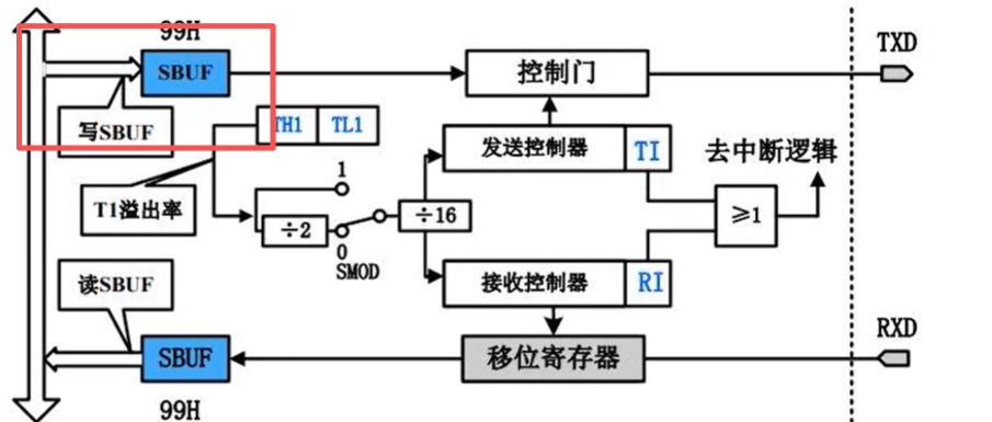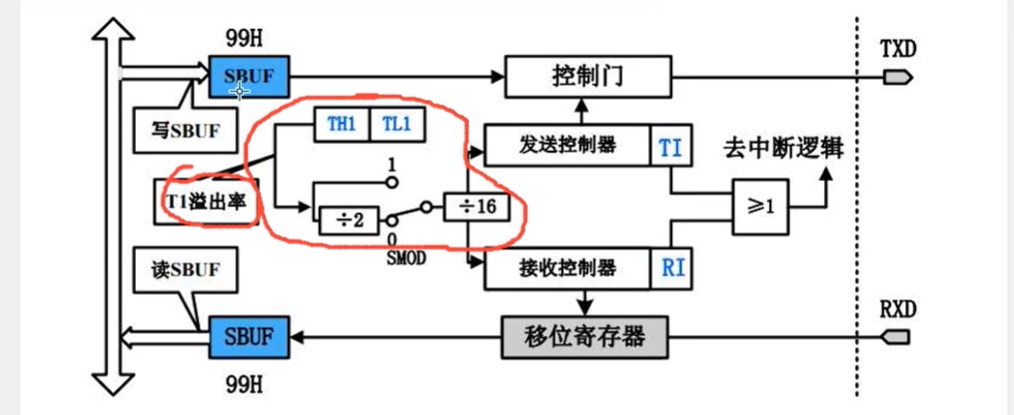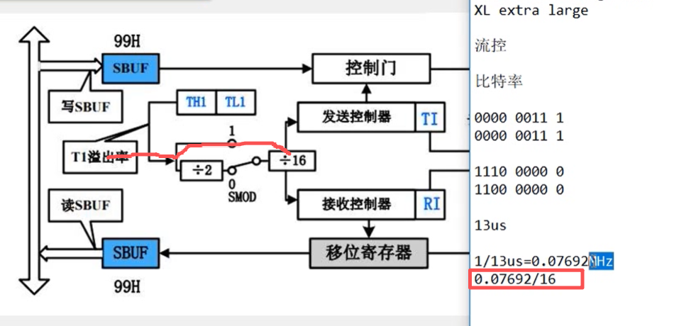我们设置的波特率倍数,SMOD0=1,是倍数,到发送接收控制器在除16是波特率