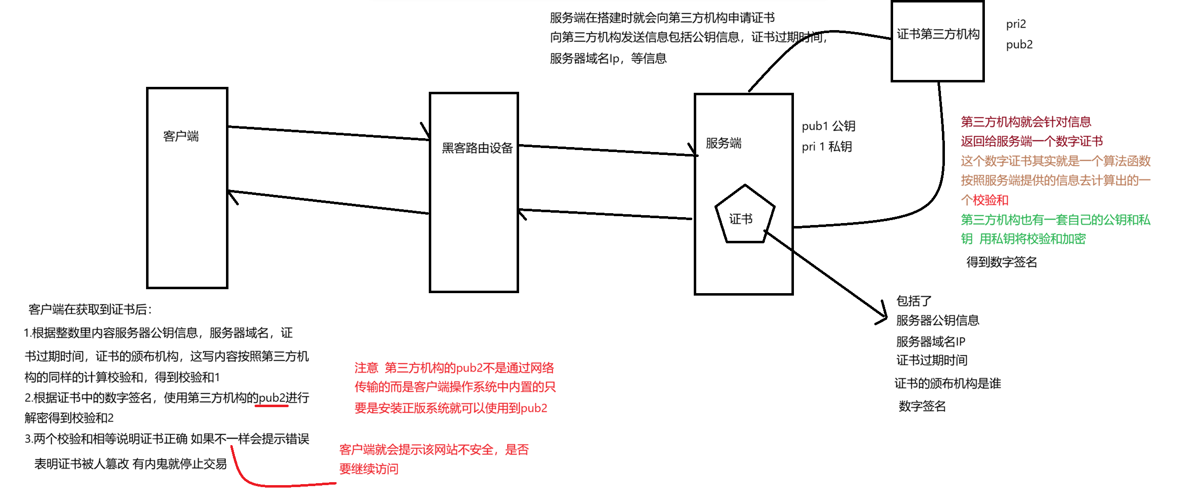 如果黑客使用自己的私钥去加密 就会导致客户端使用公钥pub2解密失败 也会提示红色界面 网站不安全是否继续