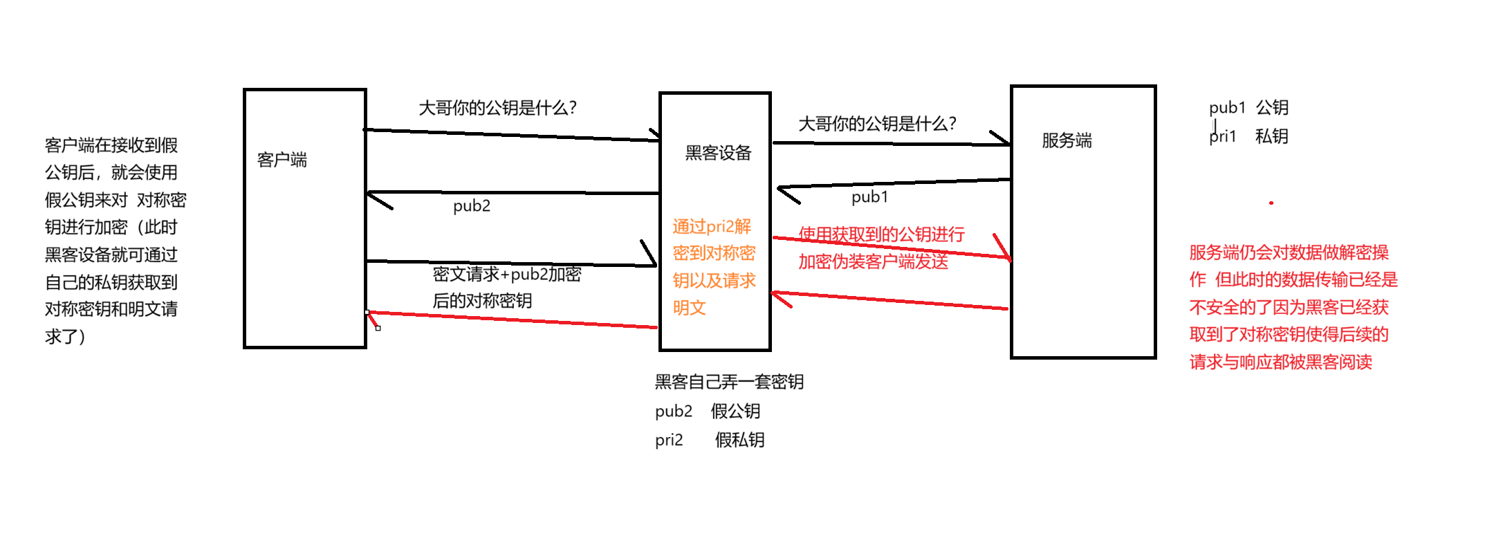 黑客自身设置一套公钥与私钥 去骗取得到对称密钥key 偷梁换柱