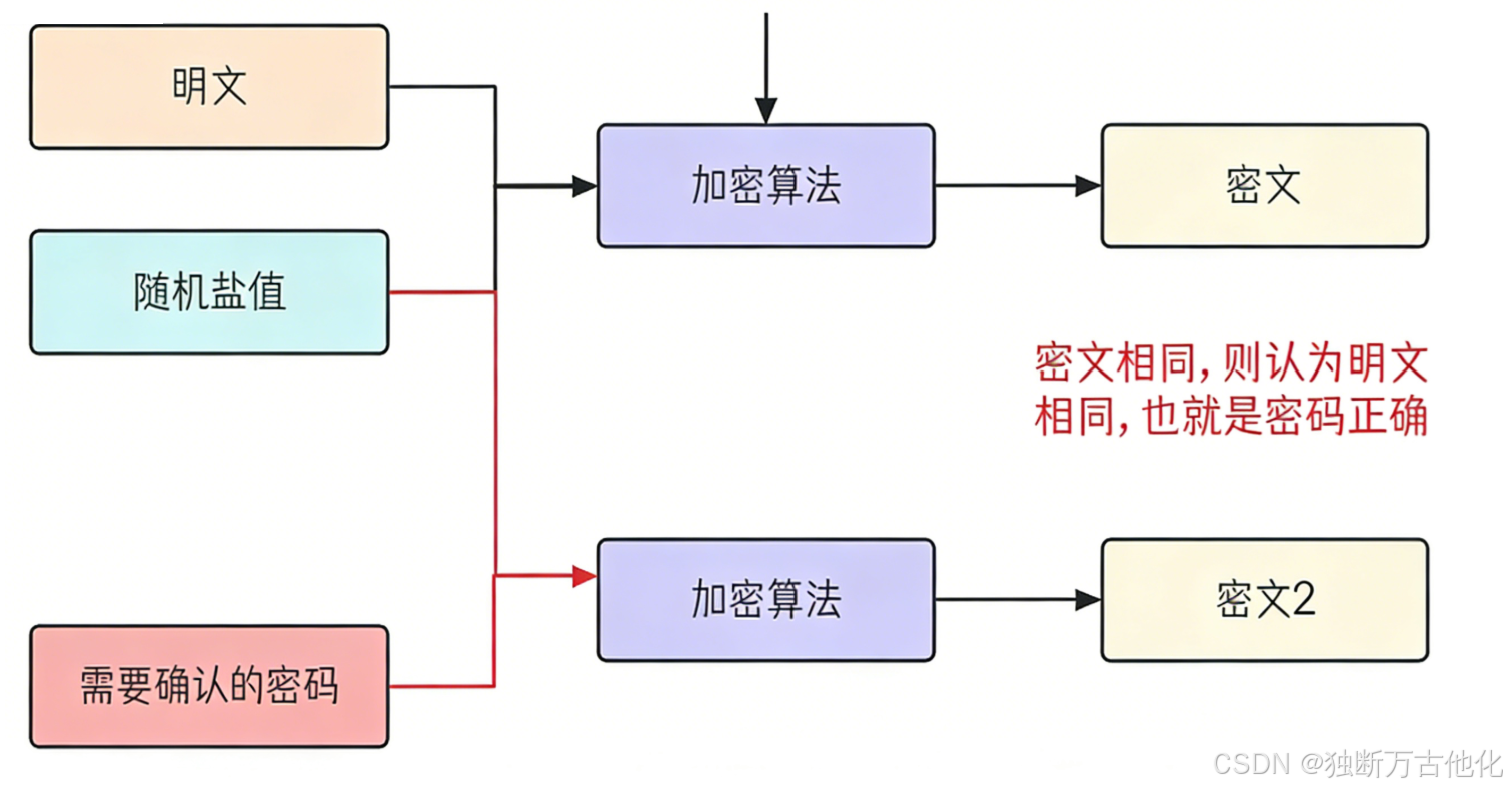 如果用户输入的密码,和盐值一起拼接后的字符串经过加密算法,得到的密文相同,我们就认为密码正确(密文相同,盐值相同,推测明文相同)