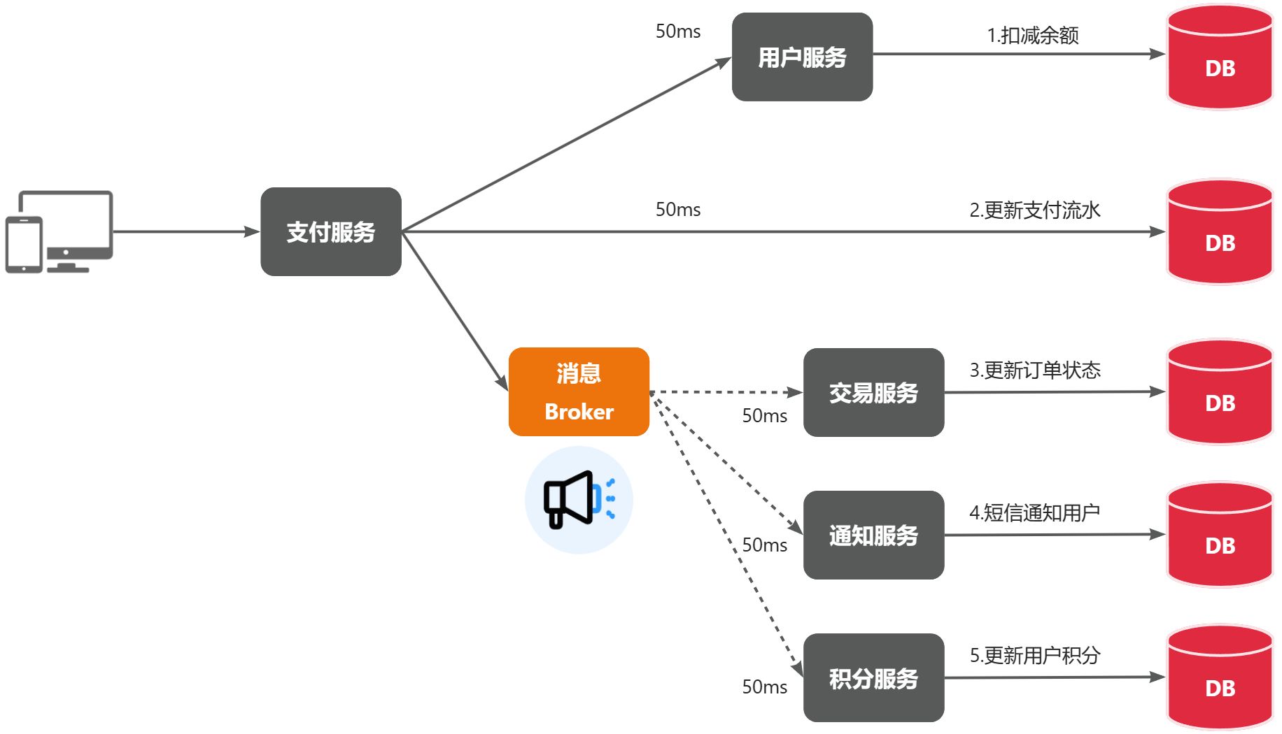 支付服务只需要处理扣减余额和发送消息这两个核心步骤,耗时从原来的 300ms 缩短到 100ms,用户体验明显提升。