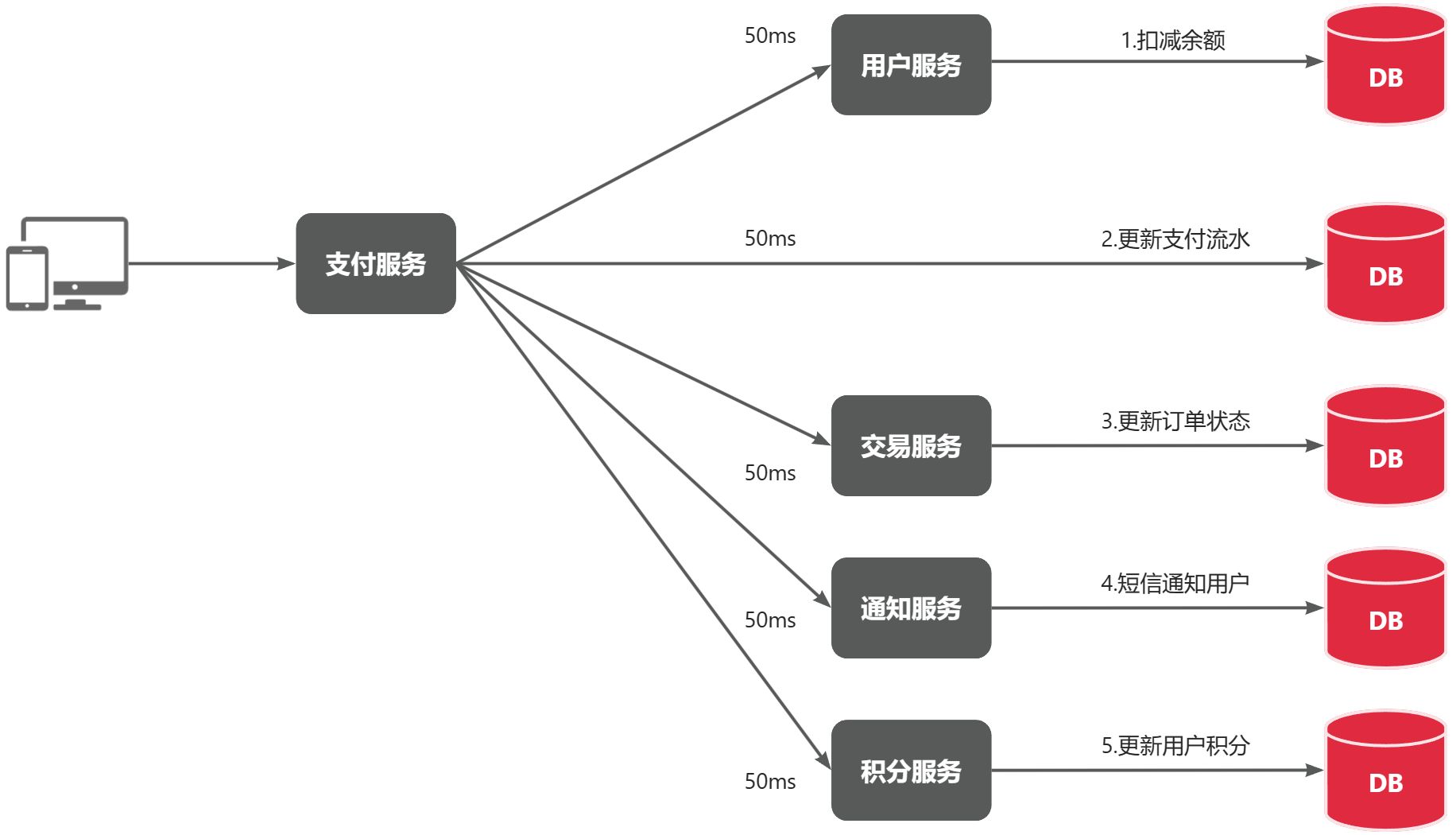 支付服务需要依次调用用户服务、交易服务、通知服务等 5 个接口,每个接口耗时 50ms,总耗时会累积到约 250ms,再加上网络开销,最终可能达到 300ms,用户等待时间长。