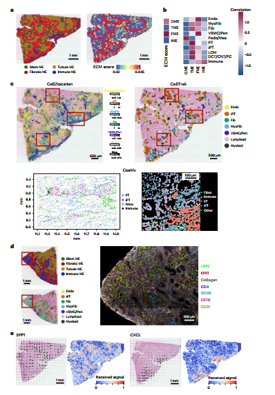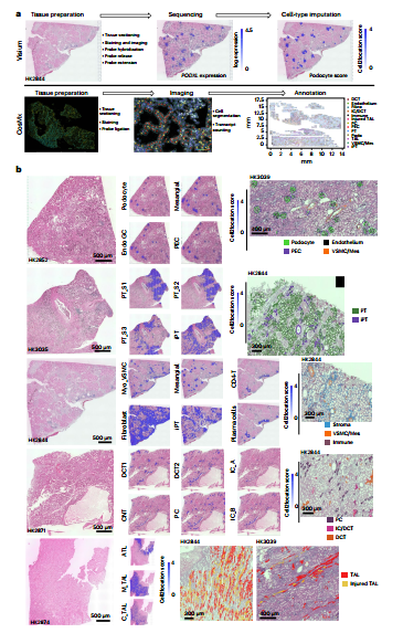 图2: 通过结合Visium和CosMx平台,研究人员在肾脏解剖结构原位精确映射了各细胞亚型,并识别出足细胞、近端小管等细胞的空间标记物。