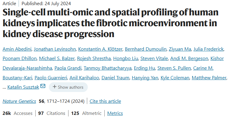 2024年7月24日,《Nature Genetics》杂志发表了由宾夕法尼亚大学Katalin Susztak团队完成的研究,该研究利用单细胞多组学和空间解析技术识别出一种能够预测肾脏疾病进展的"纤维化微环境"。