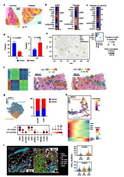 图5: 受损近端小管(iPT)细胞在FME中显著富集,并分化为VCAM1+和HAVCR1+两个具有不同代谢与粘附特征的亚群。