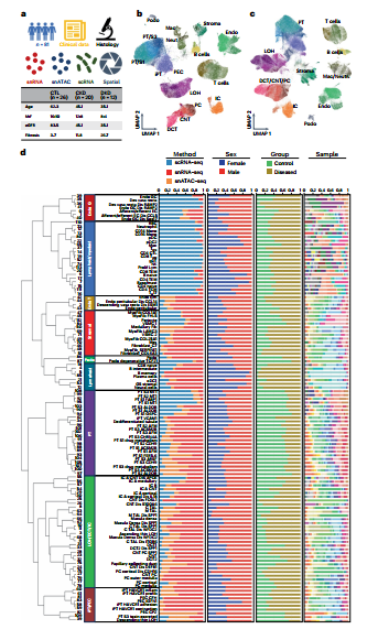 图1: 研究整合了338,565个细胞/细胞核数据,构建出包含114种不同细胞亚型或状态的多模态人类肾脏单细胞图谱。