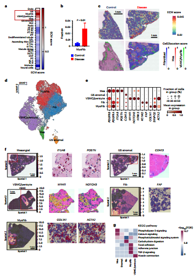 图4: 计算定义的纤维化微环境(FME)与组织学纤维化评分高度相关,并揭示了受损小管细胞、基质细胞与免疫细胞间的空间相互作用。