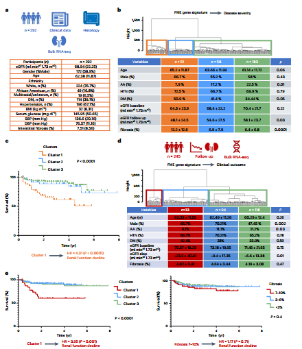图6: 在292例人类肾脏的大型外部队列中,基于FME基因签名构建的风险评分成功预测了患者肾功能下降和肾衰竭的发生。