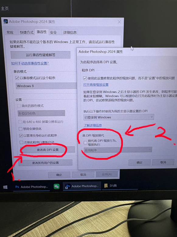 2、在桌面Adobe Photoshop 2024的图标上点击【鼠标右键】,然后点击【兼容性】,将【兼容模式】调整到【Windows8】,然后勾选【以管理员身份运行此程序】,再点击【更改高DPI设置】,在弹出的新菜单项里将【高DPI缩放替代】中的【替代高DPI缩放行为】的勾去掉然后点【确定】,再点【应用】、【确定】;