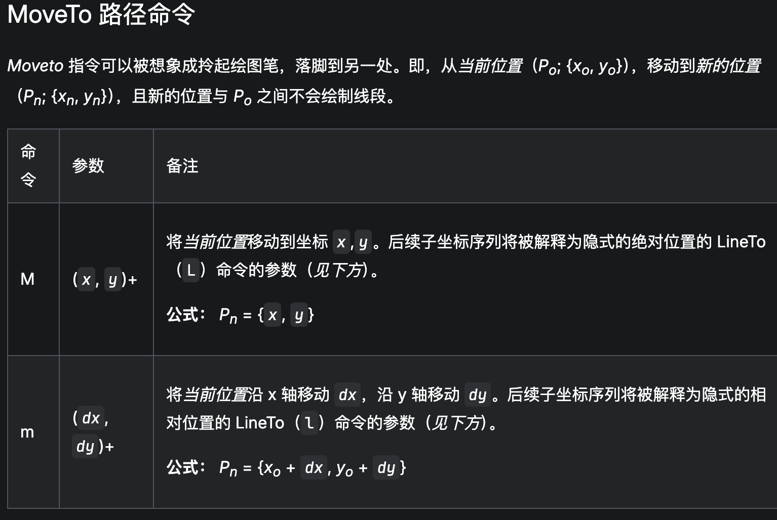 | L | (x, y)+ | 在当前位置 和指定位置 x,y 之间绘制一条线段。后续子坐标序列将被解释为隐式的绝对位置的 LineTo(L)命令的参数。 公式: Po′ = Pn = {x, y} |