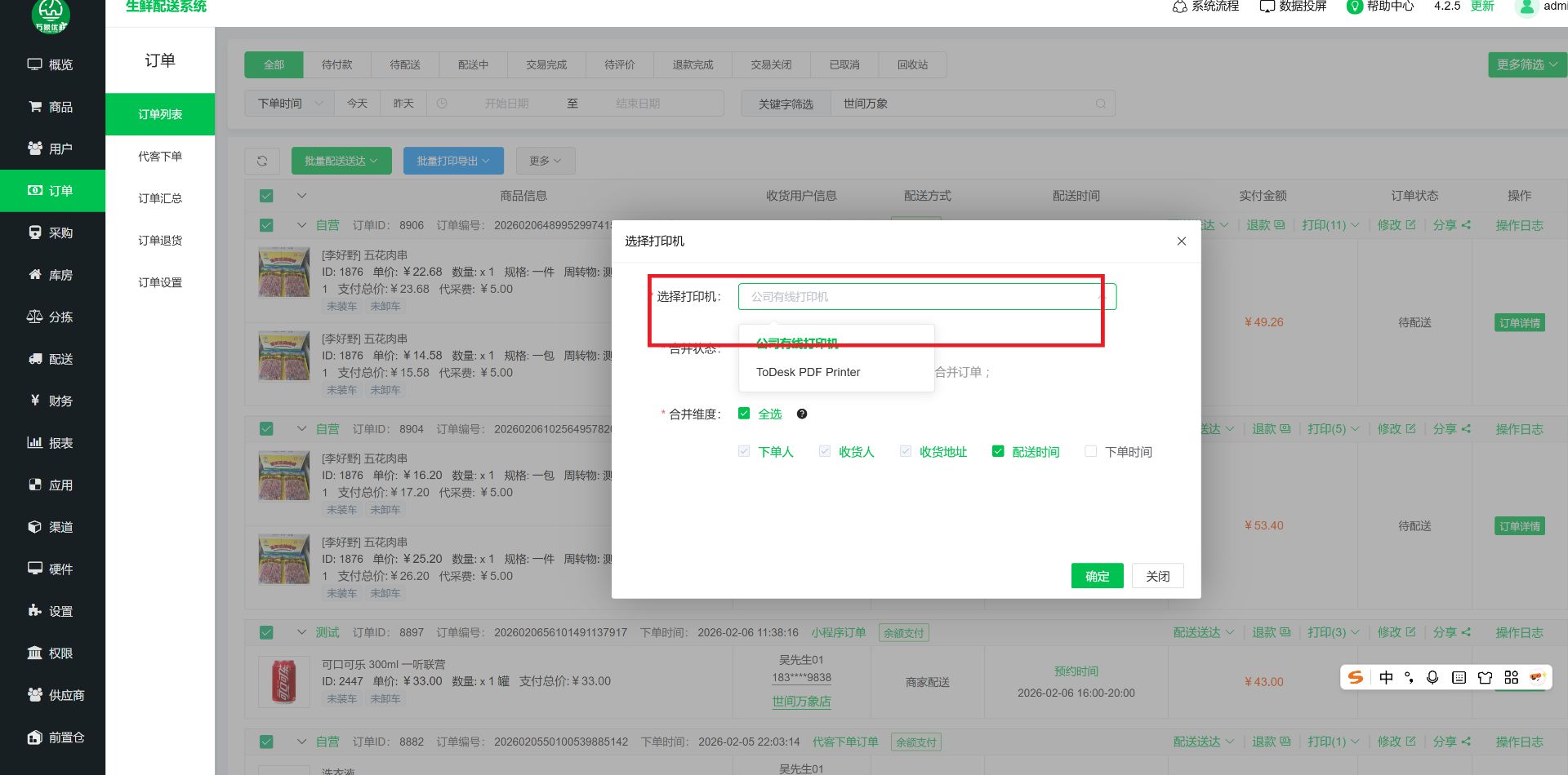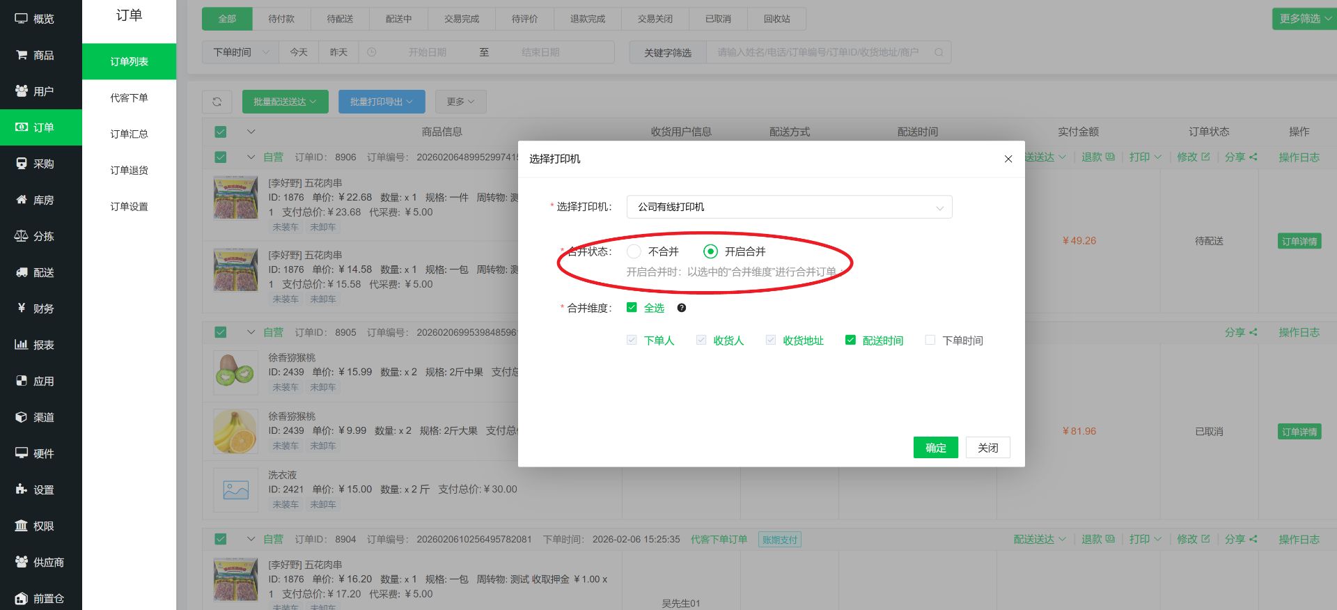 合并打印支持合并金额计算和合并表格展示,可按下单人、收货人、收货地址、配送时间、下单时间五个维度进行合并;【解读】:合并打印时,系统会自动核算所有合并订单的总金额,用统一表格展示,还能按指定维度合并(如同一个收货人、同一配送时间的订单合并),方便配送人员核对总金额、快速配送。