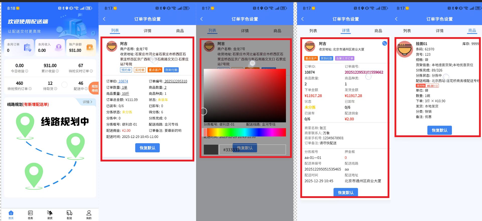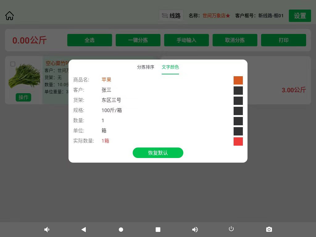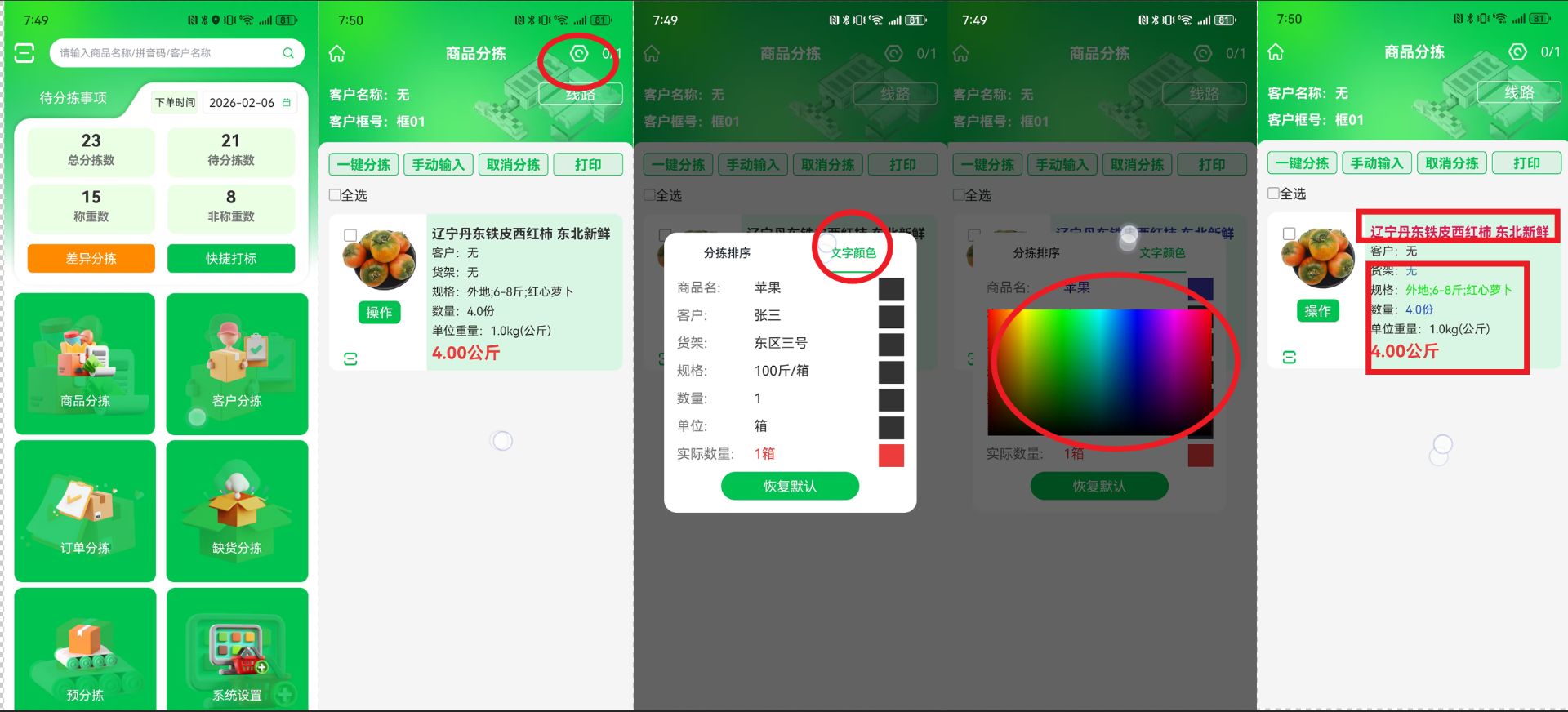 手机分拣APP端新增文字自定义颜色设置功能,如客户名字、商品名字等均可自定义显示颜色;【解读】:管理员可根据分拣需求,修改文字颜色(如将重点客户名字设为红色、重量设为橙色),方便分拣人员快速识别重点信息,提升分拣效率。