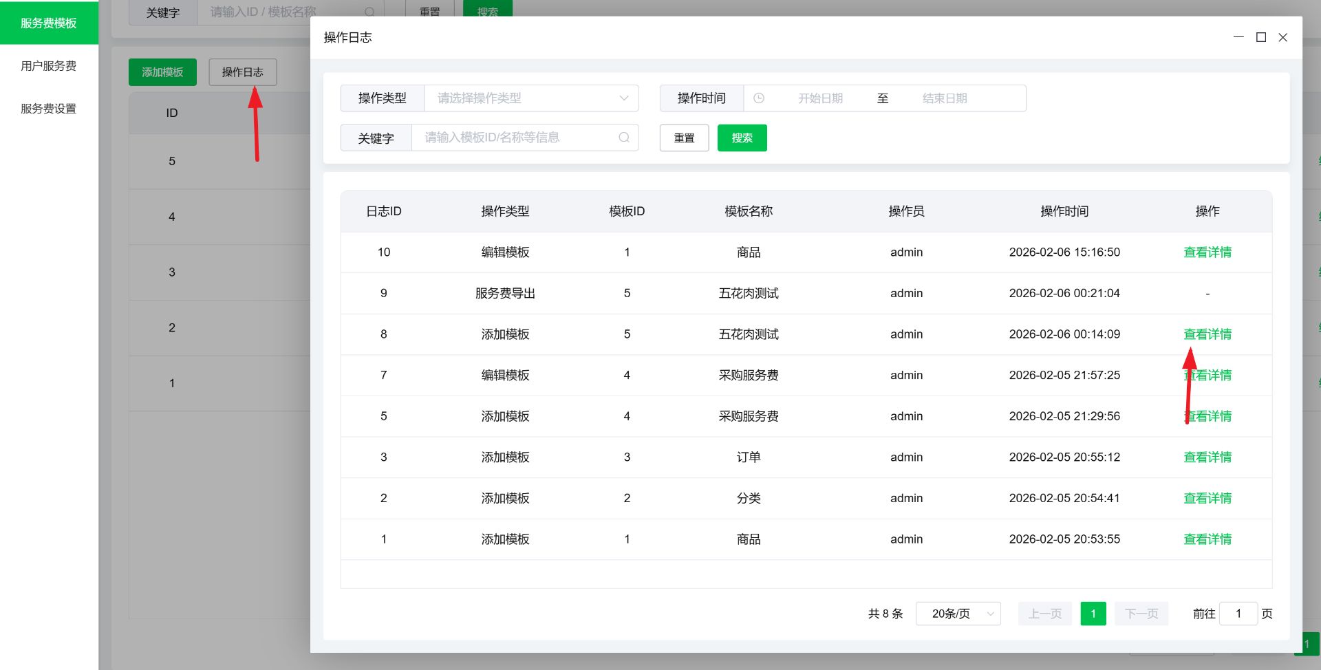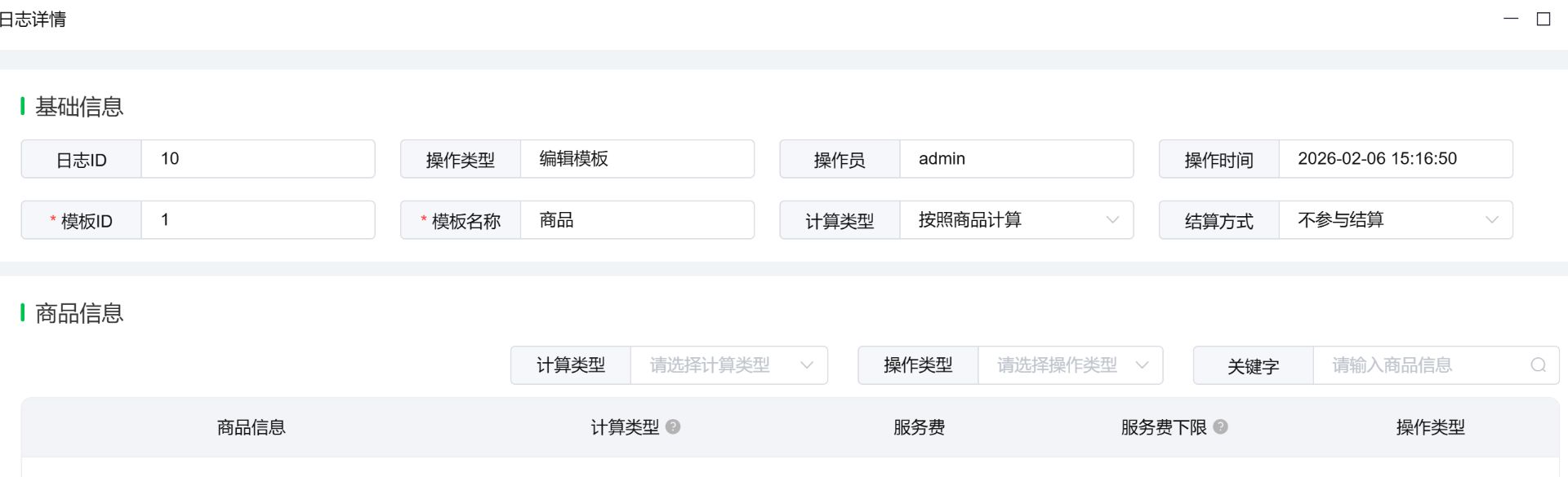 新增服务费/代采费操作日志功能,所有相关操作均会记录,便于追溯和排查问题;【解读】:不管是添加、修改还是删除服务费/代采费模版,系统都会记录操作人、操作时间、操作内容,后续若出现费用核算异常、纠纷,可快速查到问题根源,便于排查和追责。