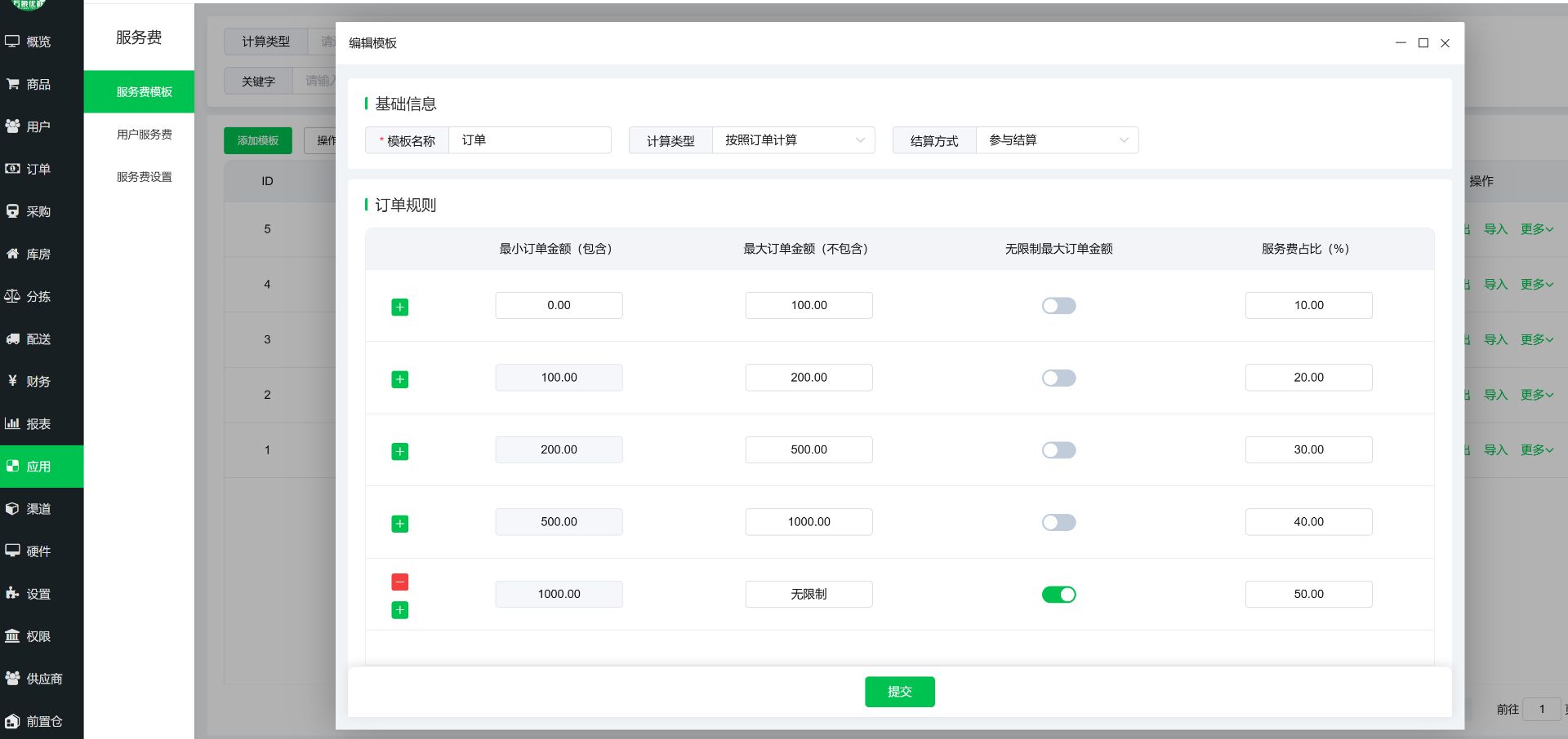 后台服务费支持添加、绑定、参数设置等全流程操作,满足多样化代采费服务费管理需求;【解读】:从创建服务费代采费、绑定到具体客户/商品,再到调整各项规则,全程可在后台完成,能适配不同计费类型。