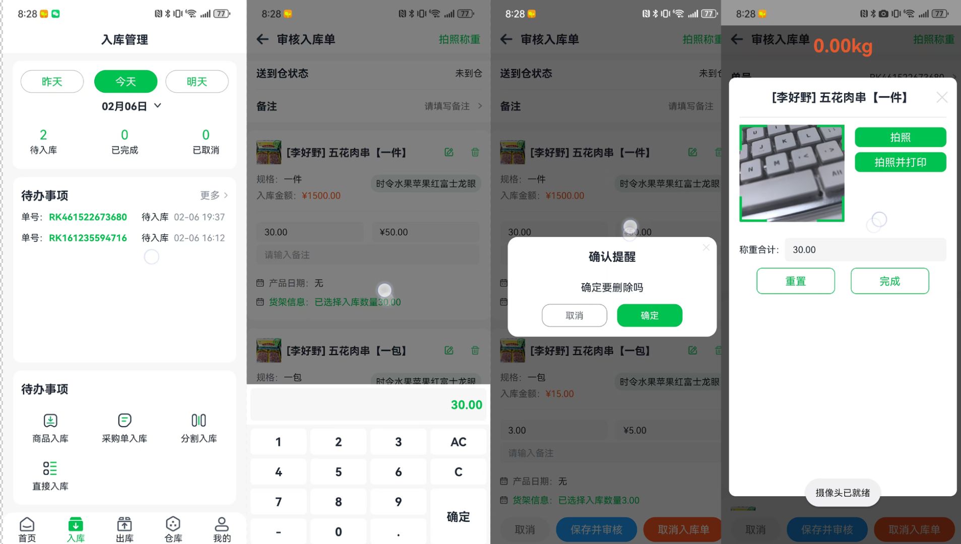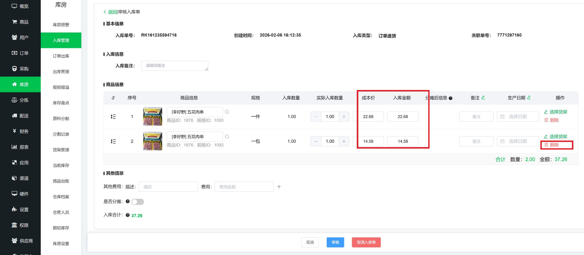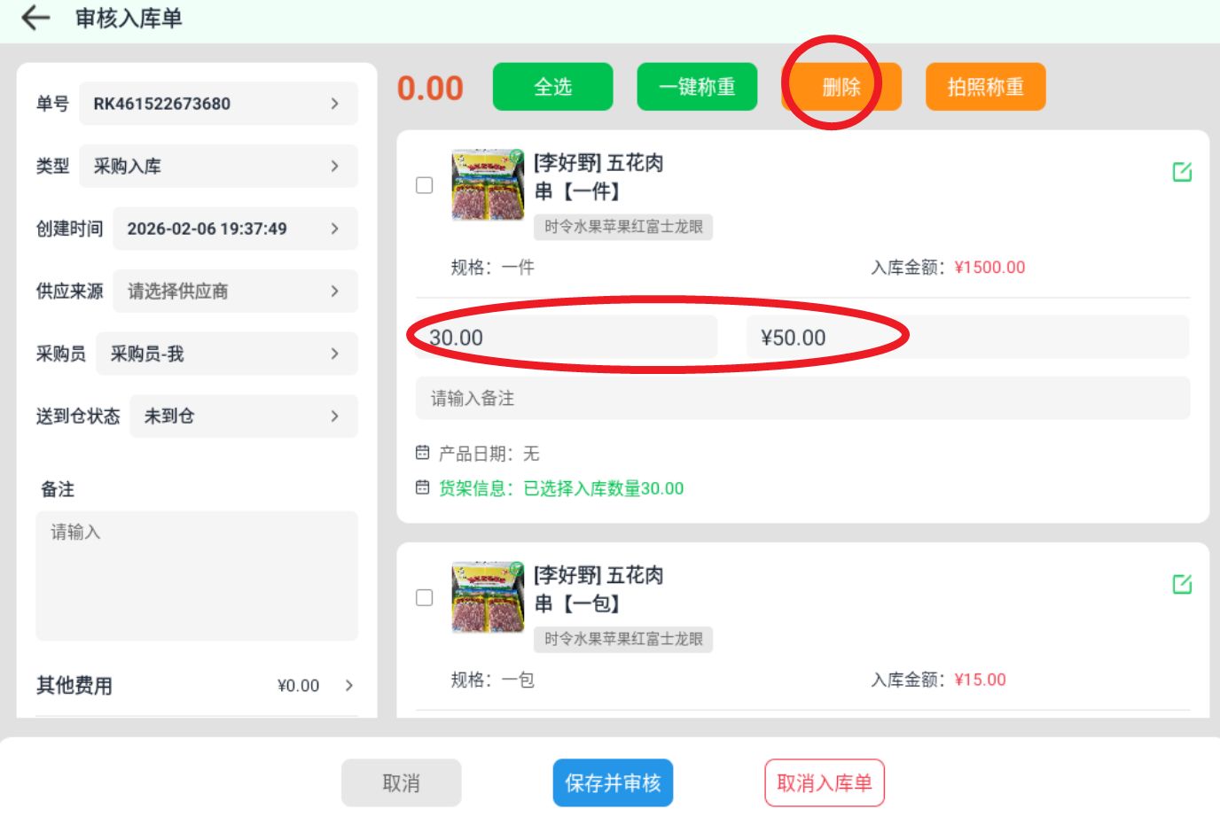一体称仓库端采购入库和商品入库审核逻辑,支持编辑和删除商品,提升入库审核灵活性;【解读】:分拣人员在一体称仓库端审核入库时,若发现商品信息错误(如规格不符),可直接编辑、删除商品,不用切换到其他终端,提升入库审核效率,适配仓库分拣场景。