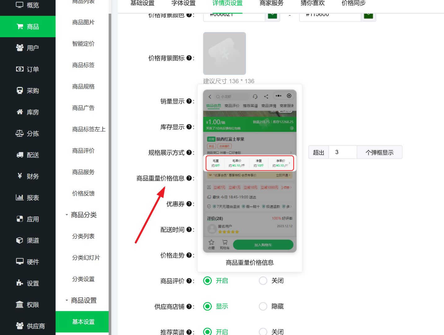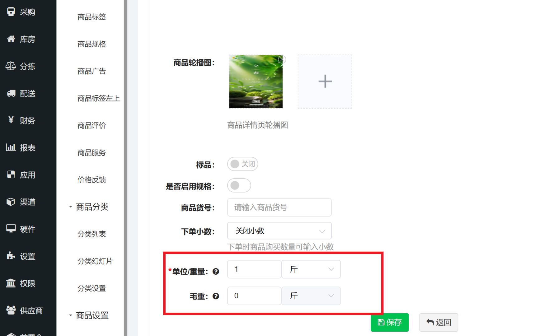 商品列表编辑商品时,新增毛重信息字段,可录入商品的毛重数据;【解读】:生鲜商品常需要区分毛重(含包装重量)和净重,新增毛重字段后,可精准记录商品毛重,适配"按毛重计价""毛重核算库存"等场景,提升商品信息准确性。