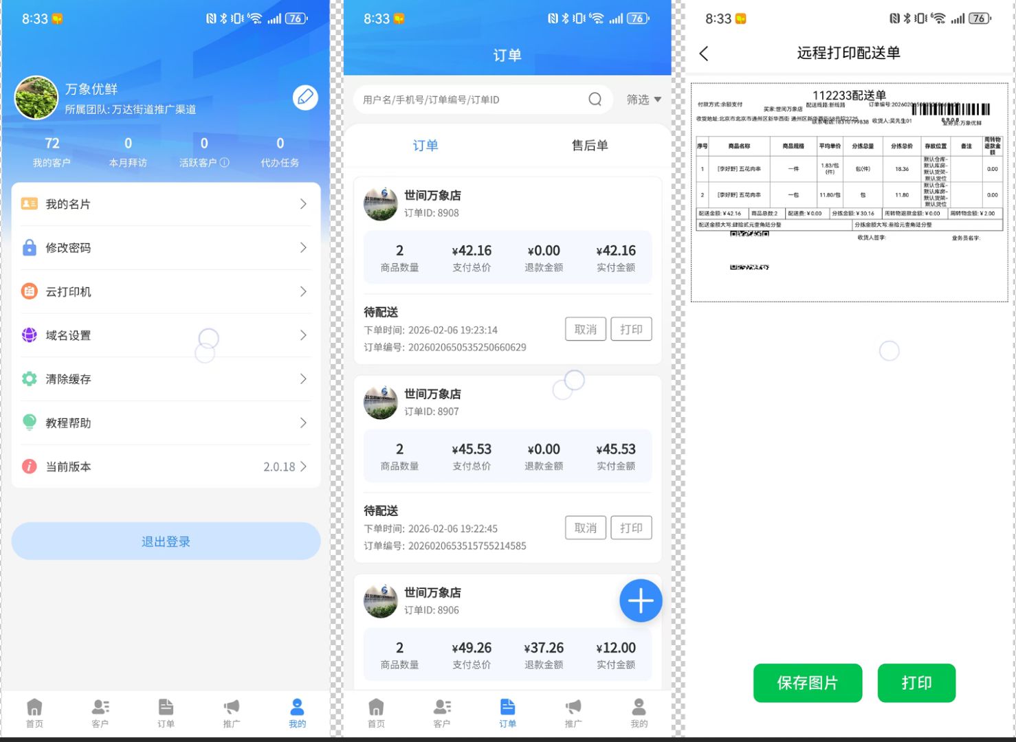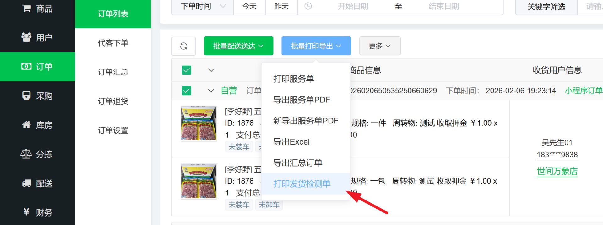 优化订单列表,增加批量打印发货检测单功能,同时支持选择打印机,提升发货检测单打印效率;【解读】:管理员可在订单列表中,批量选择订单打印发货检测单(用于核对发货商品的数量、规格),还能选择指定打印机输出,不用逐单打印、来回切换打印机,提升发货核对效率。