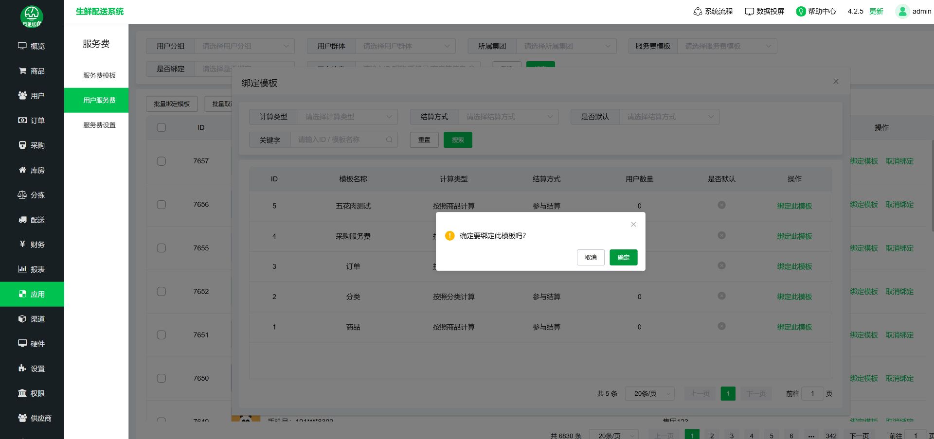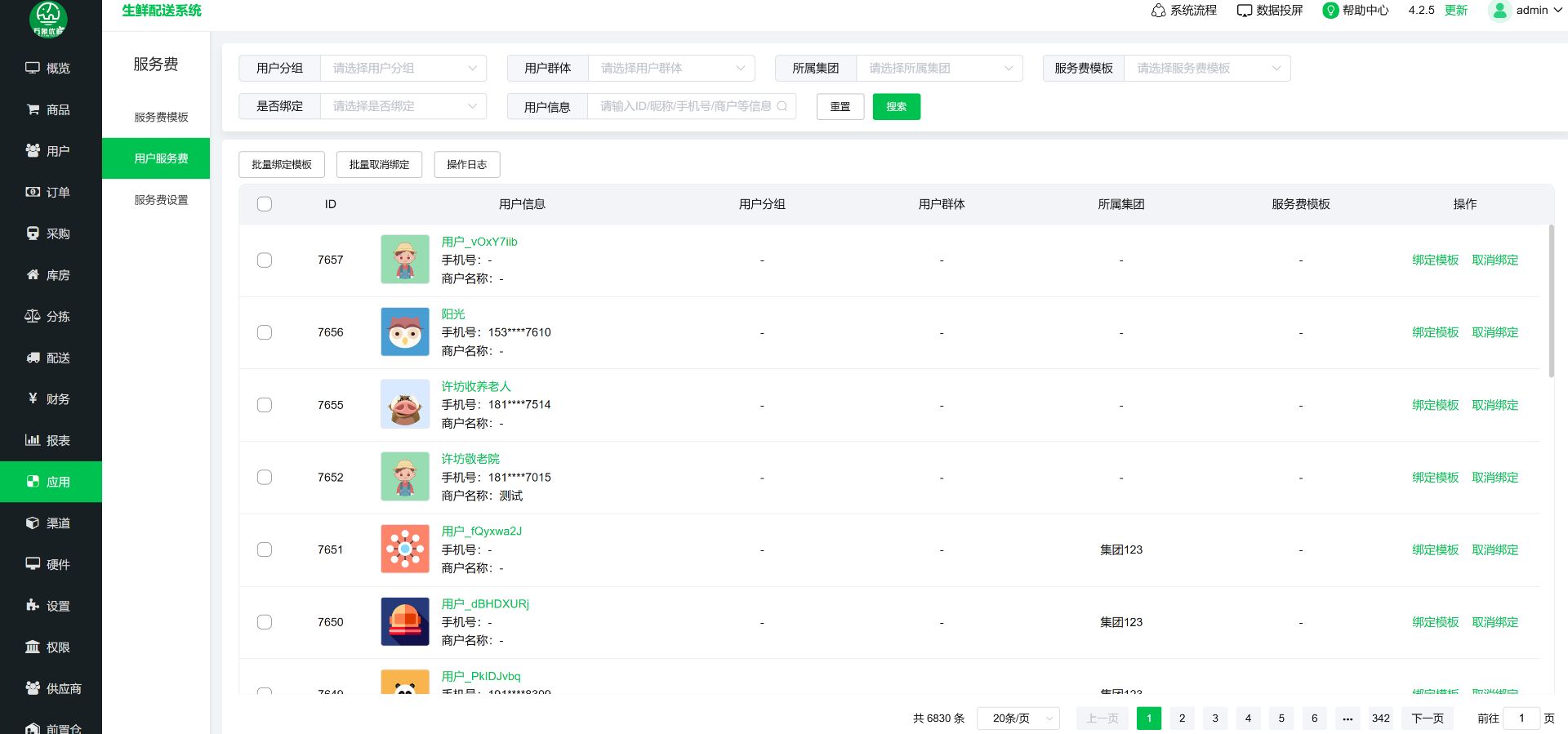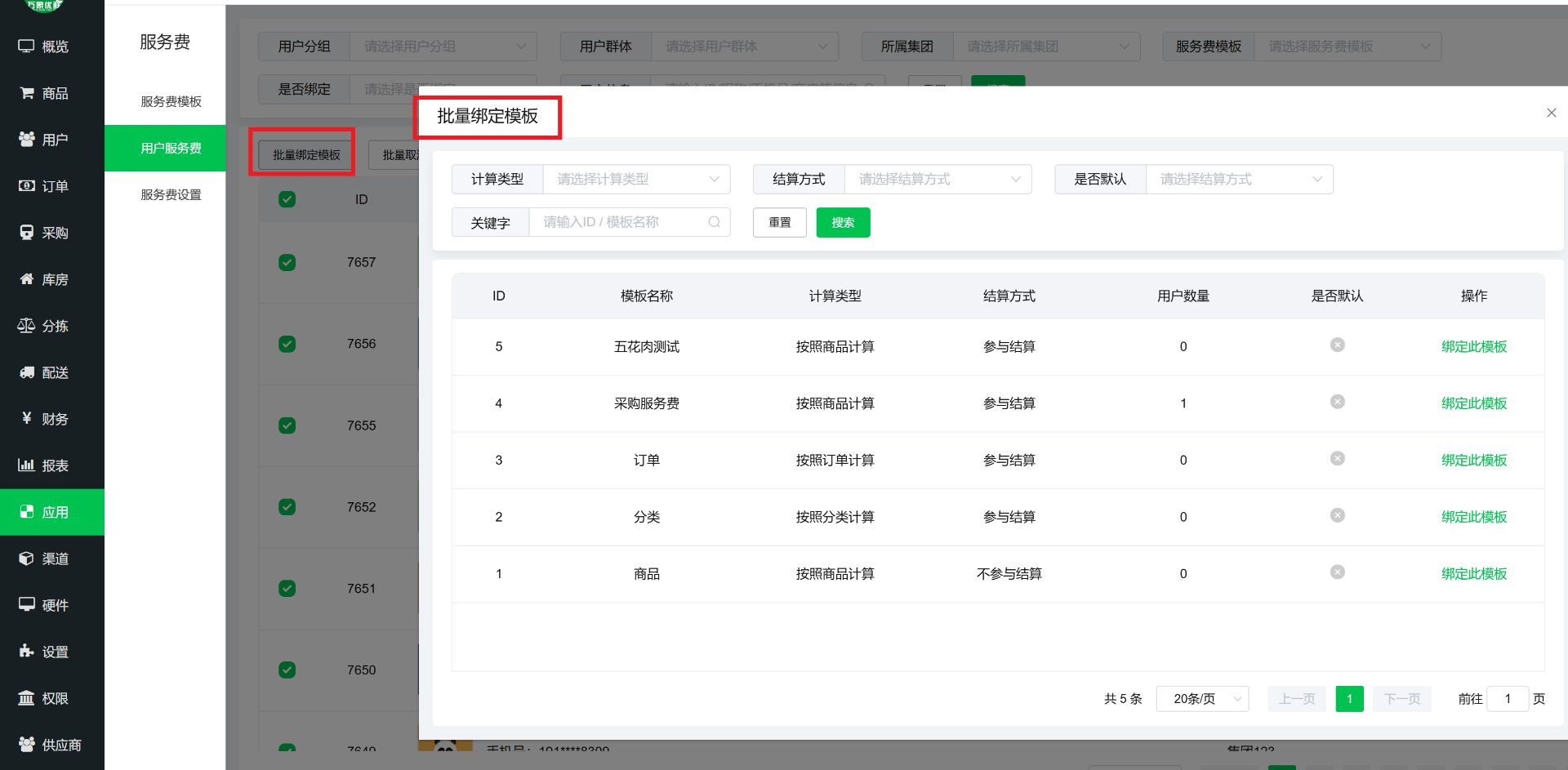 支持用户服务费批量绑定模版、批量取消绑定,提升批量操作效率;【解读】:当需要统一调整多个用户的服务费模版(如某类客户统一更换模版)时,可批量绑定或取消绑定,不用逐个操作,大幅提升管理员工作效率。