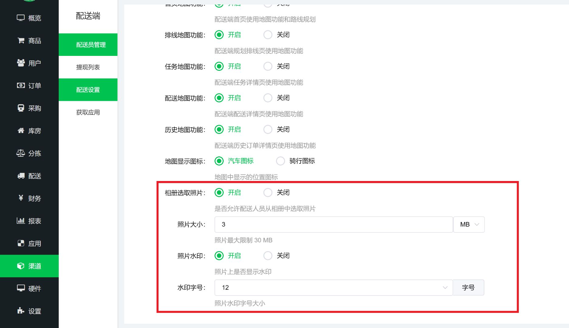 新增配送端是否使用相册的设置开关,可控制配送端是否允许访问手机相册;【解读】:管理员可控制配送人员必须用摄像头拍照上传(如送达照片),避免配送人员上传无关照片、虚假凭证,保障凭证真实性,规范配送管理。