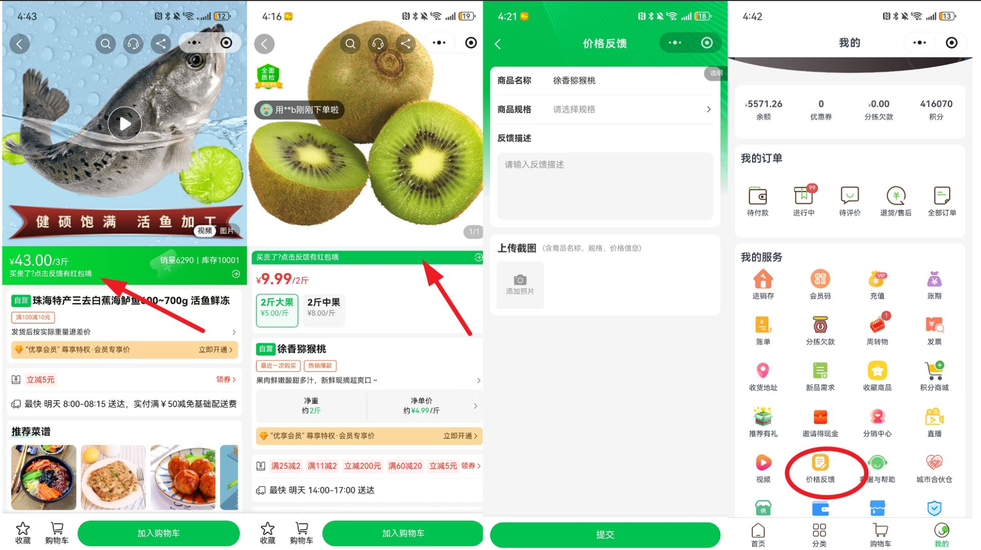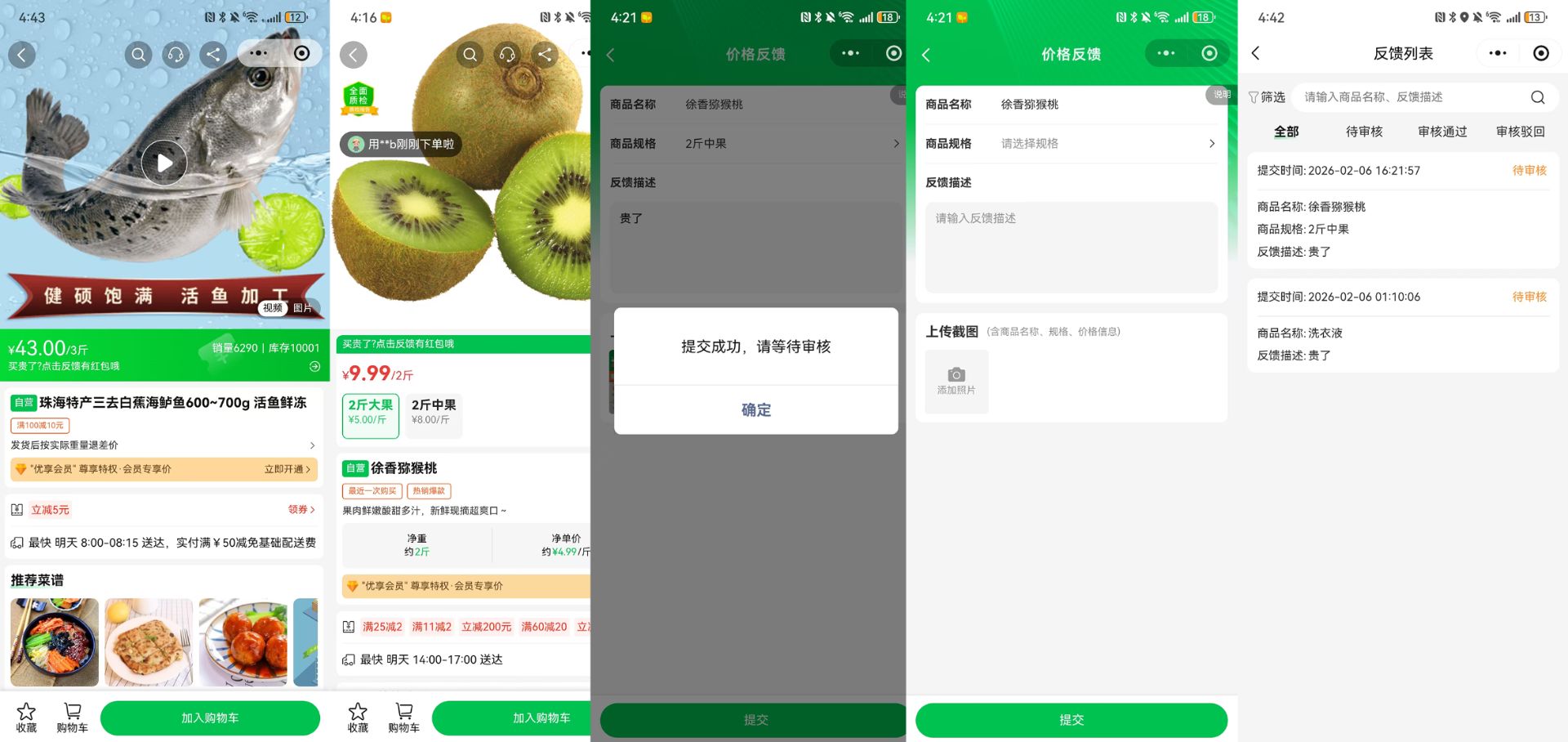 商城端"我的"页面中,新增反馈状态功能,用户可查看自己提交的反馈的处理状态;【解读】:用户提交价格反馈后,可在自己的商城个人中心,查看反馈是"待处理""已核实"还是"已调整",提升反馈透明度,让用户更有参与感。