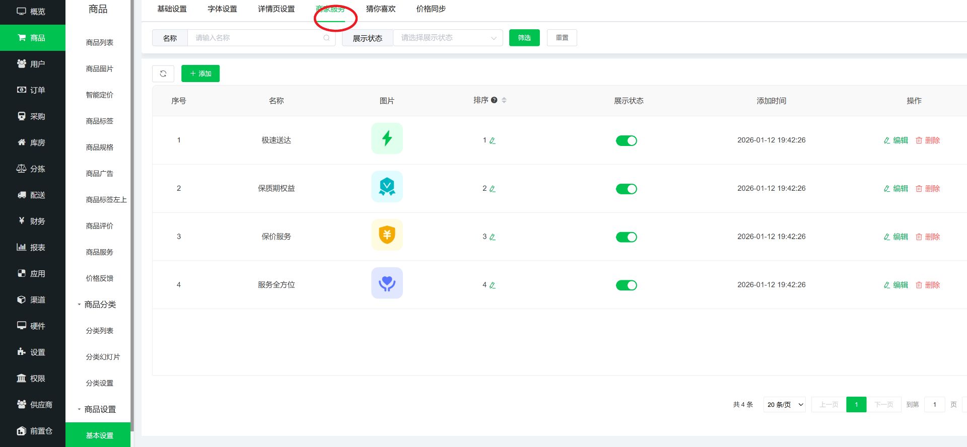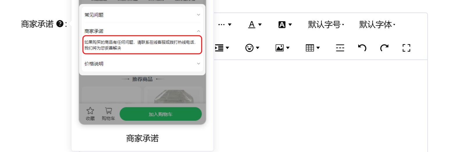 后台新增配置商品商家承诺相关设置,可设置商家对商品的承诺内容;【解读】:可添加商家对商品的保障承诺(如"当日鲜采""24小时送达""坏果包赔"),设置后将在前端展示,提升商品可信度,吸引用户购买。