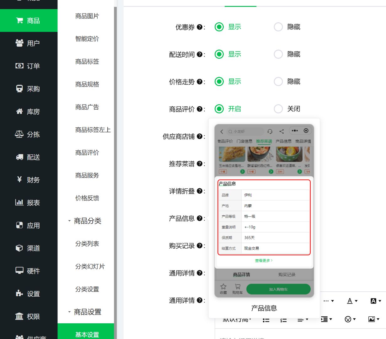 新增产品信息设置是否显示的开关,可控制商品详情页中产品信息的展示状态;【解读】:可根据商品特性,选择是否在详情页显示部分产品信息(如产地、保质期、储存方式),适配不同商品的展示需求,避免信息冗余。