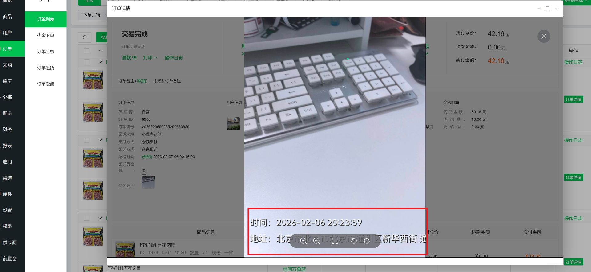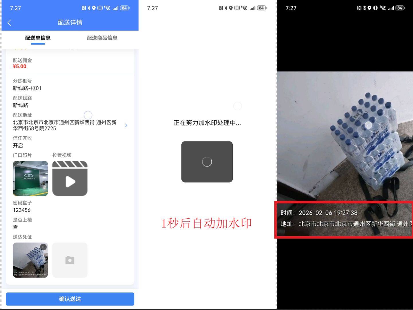 配送端安卓、IOS端新增送达凭证水印功能,拍照留存送达凭证时自动添加水印;【解读】:配送人员用手机(安卓、IOS系统)拍摄送达照片时,系统自动添加水印(含时间、定位),确保送达凭证真实有效,可追溯,避免虚假送达、延误送达等纠纷。