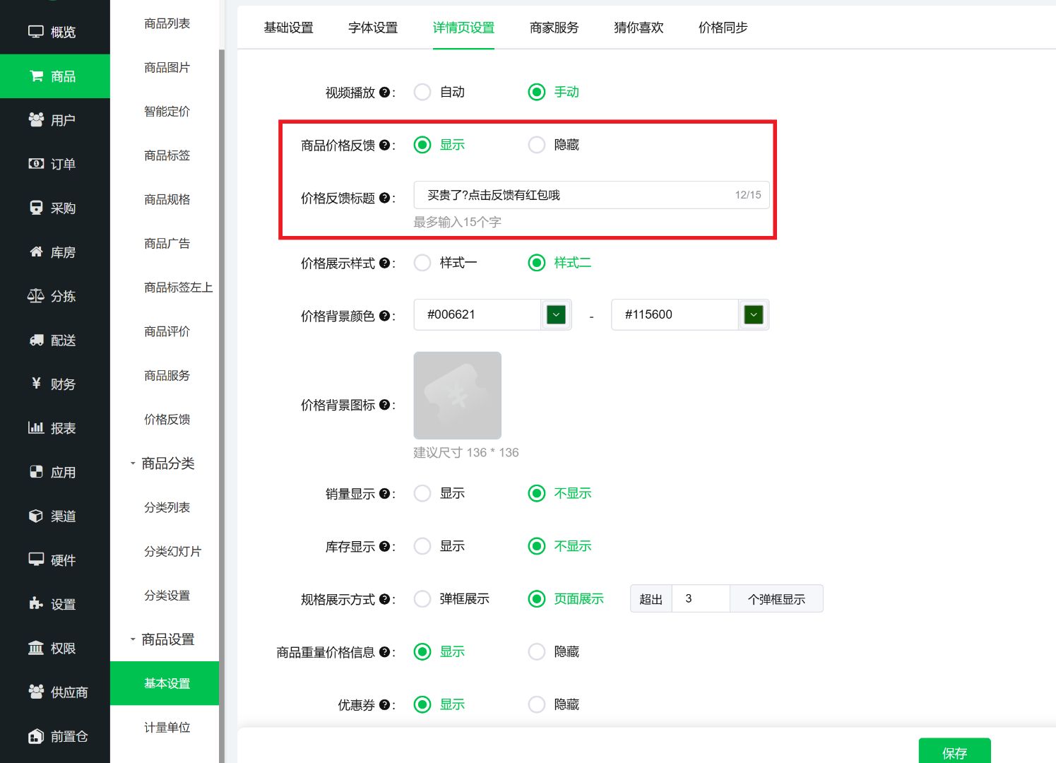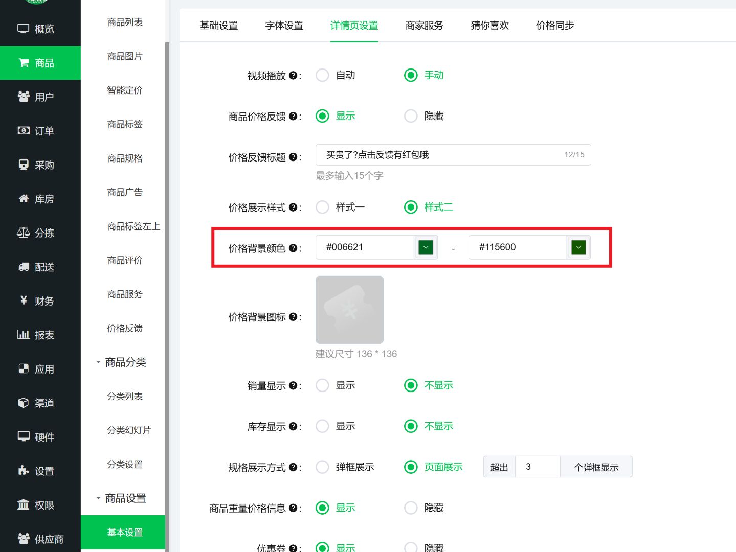 新增详情价格背景颜色设置功能,可调整商品详情页价格展示区域的背景颜色;【解读】:可自定义价格展示区域的背景色(如红色突出优惠、绿色突出原价),让价格信息更醒目,方便用户快速捕捉核心信息。