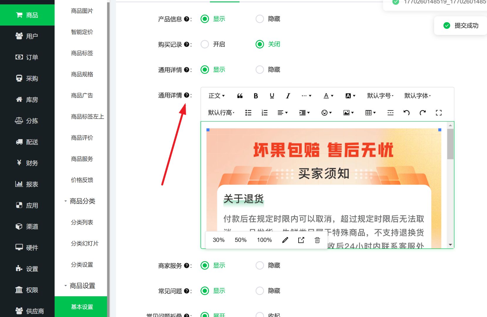 新增商品通用详情设置开关以及图片设置,可统一配置所有商品详情页的基础样式和图片;【解读】:管理员可统一设置所有商品详情页的通用样式(如是否显示通用服务说明)、图片展示规则(如尺寸、排列方式),不用逐个商品设置,提升页面统一性和操作效率。