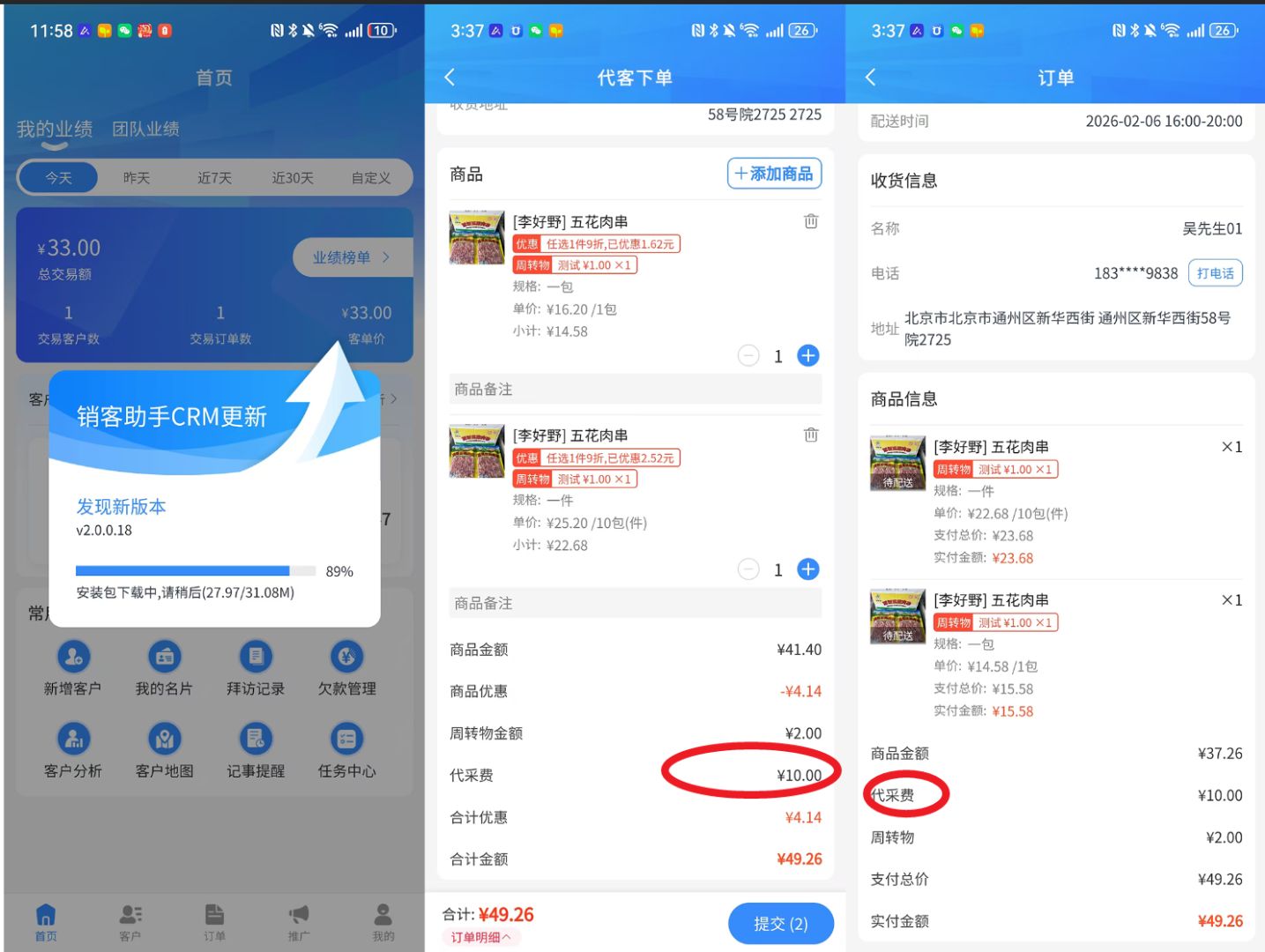 业务员APP代客下单端新增代采费相关功能,代客下单时可自动计算并显示代采费;【解读】:业务员帮客户下单时,系统会自动核算代采费并显示,便于业务员与客户确认费用,不用手动计算,提升下单效率和准确性。